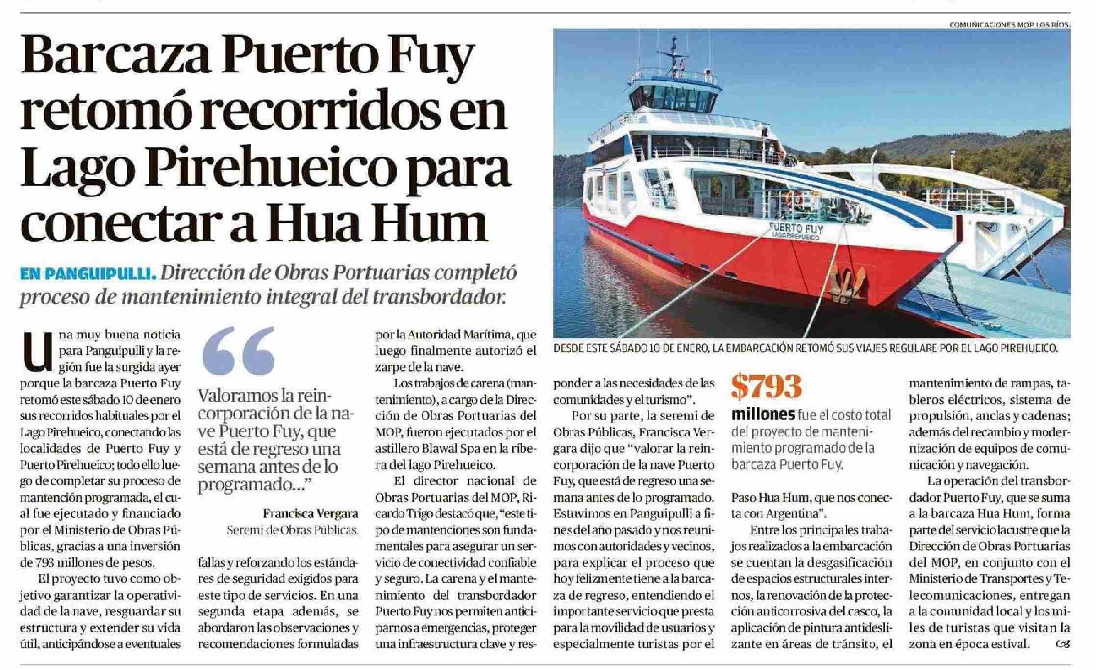 Barcaza Puerto Fuy retomó recorridos en Lago Pirehueico para conectar a Hua Hum