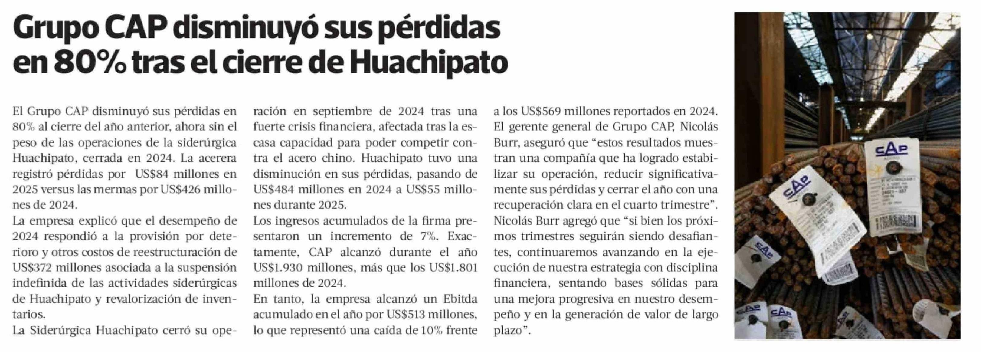 Título: Grupo CAP disminuyó sus pérdidas en 80% tras el cierre de Huachipato