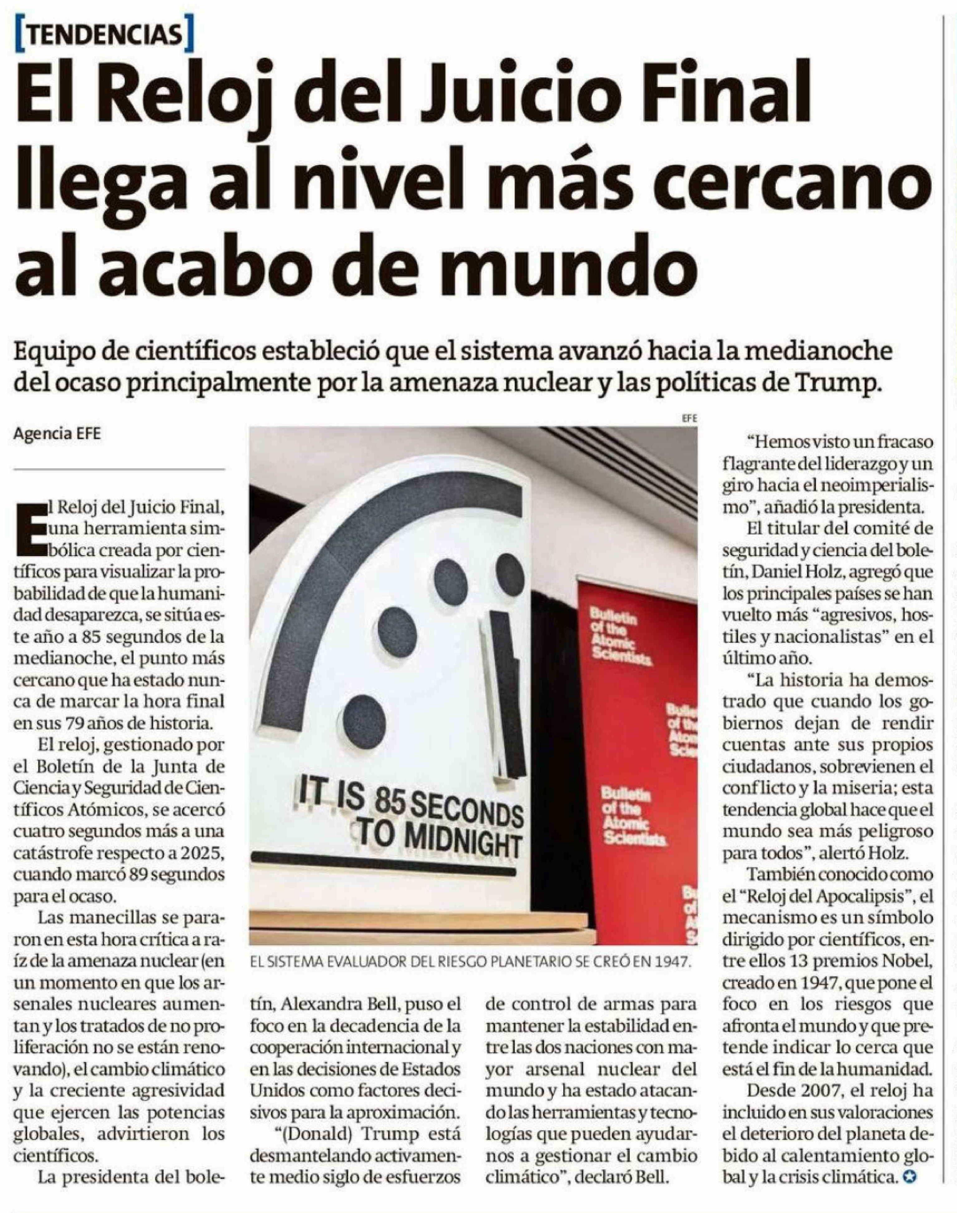 El Reloj del Juicio Final llega al nivel más cercano al acabo de mundo