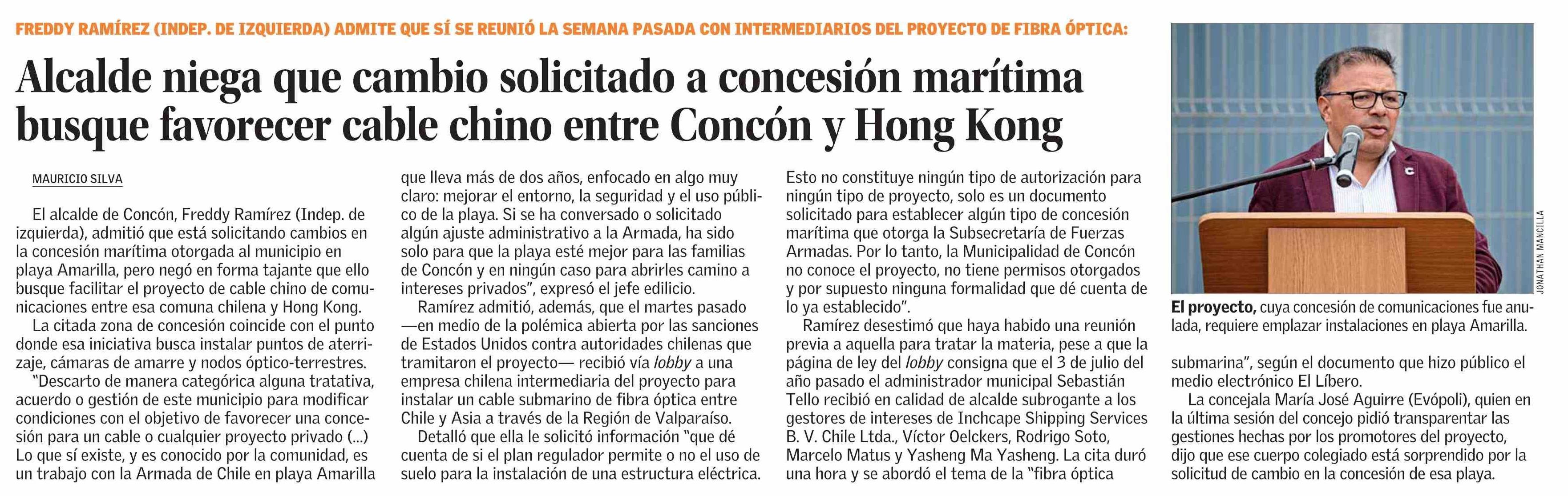 Alcalde niega que cambio solicitado a concesión marítima busque favorecer cable chino entre Concón y Hong Kong