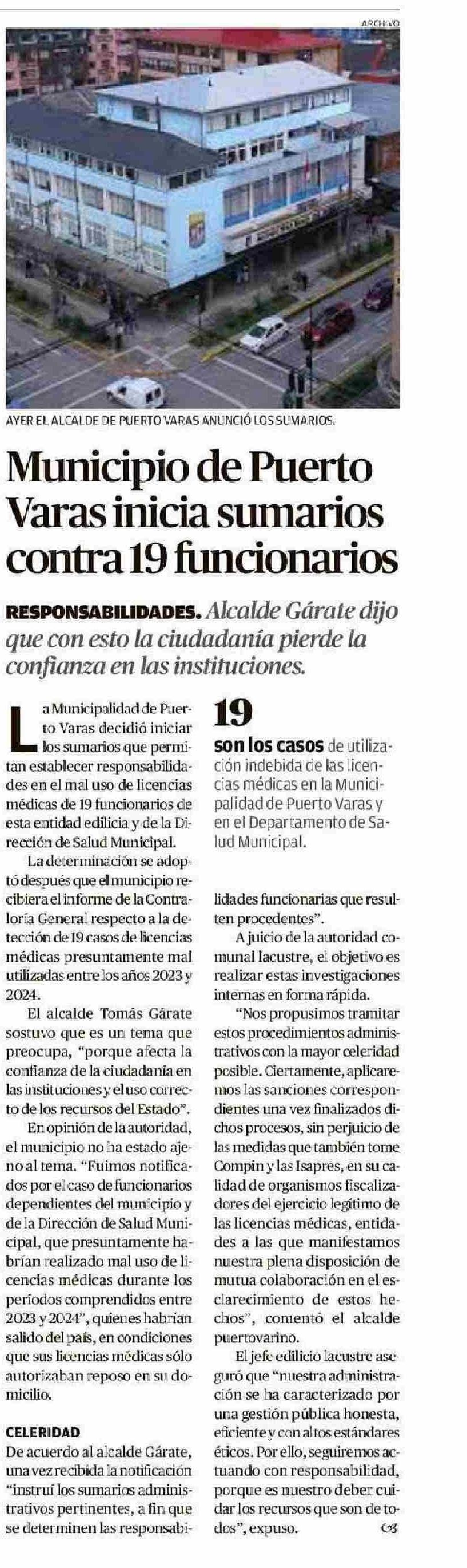 Municipio de Puerto Varas inicia sumarios contra 19 funcionarios