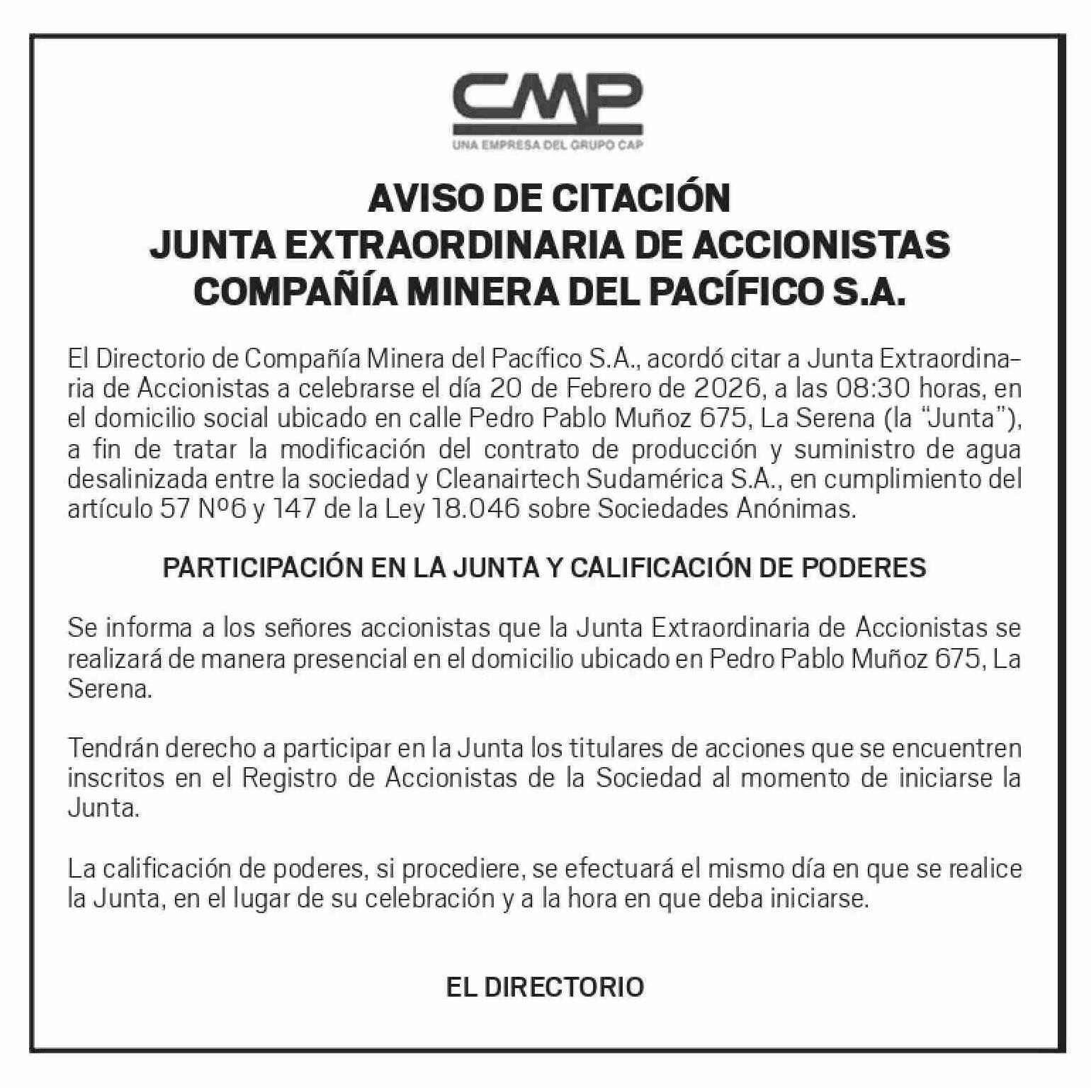 Extractos: AVISO DE CITACIÓN JUNTA EXTRAORDINARIA DE ACCIONISTAS COMPAÑÍA MINERA DEL PACÍFICO S.A.