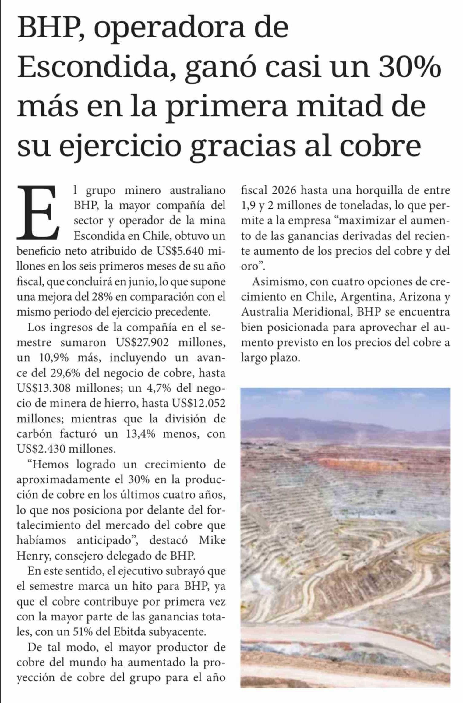 BHP, operadora de Escondida, ganó casi un 30% más en la primera mitad de su ejercicio gracias al cobre