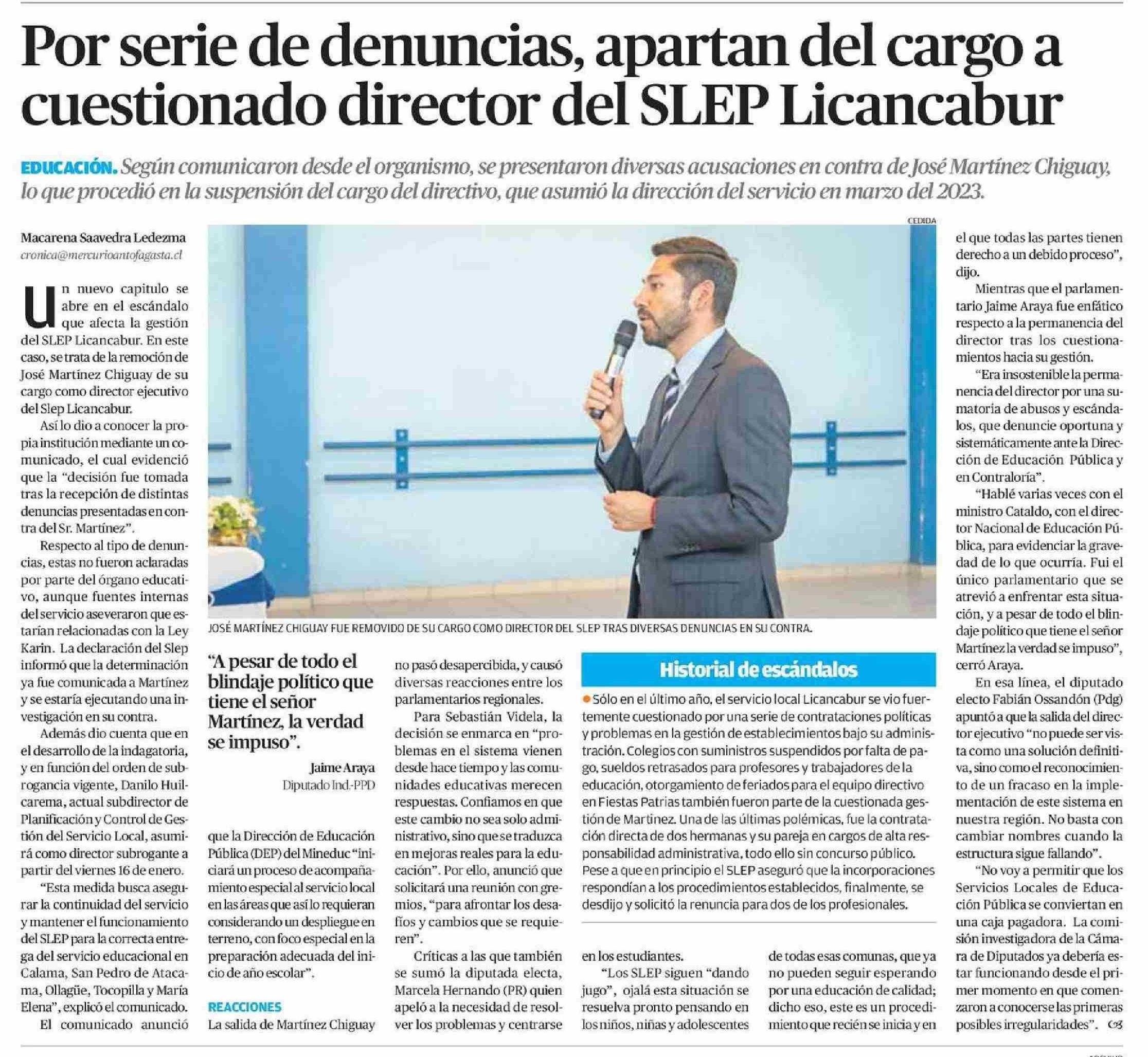 Por serie de denuncias, apartan del cargo a cuestionado director del SLEP Licancabur