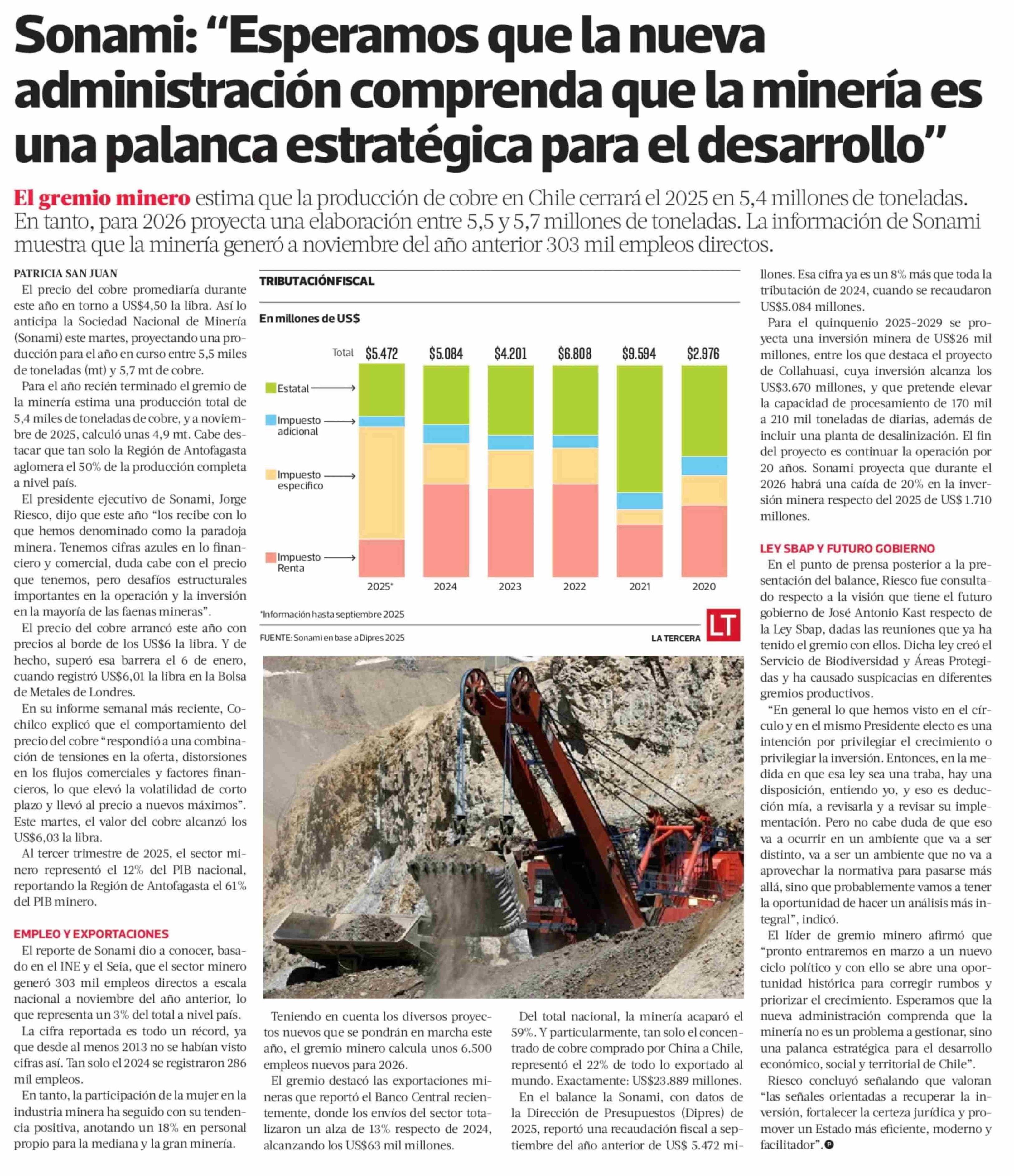 Sonami: "Esperamos que la nueva administración comprenda que la minería es una palanca estratégica para el desarrollo"