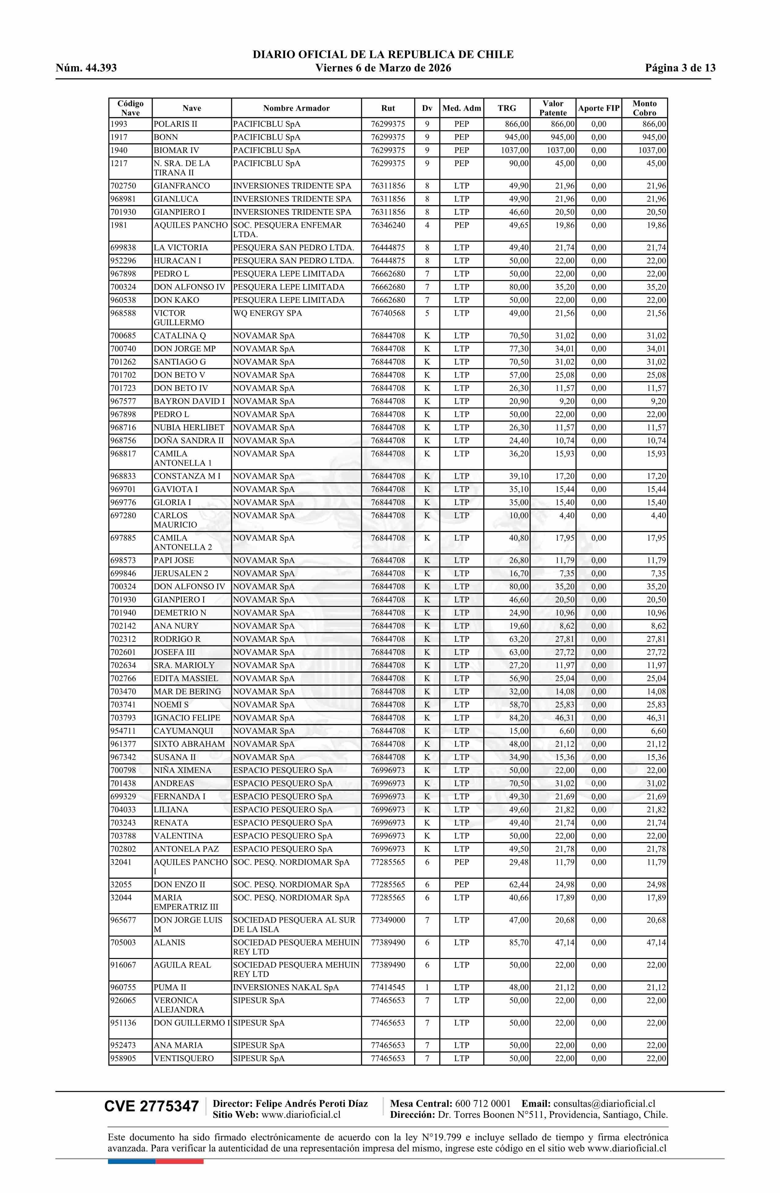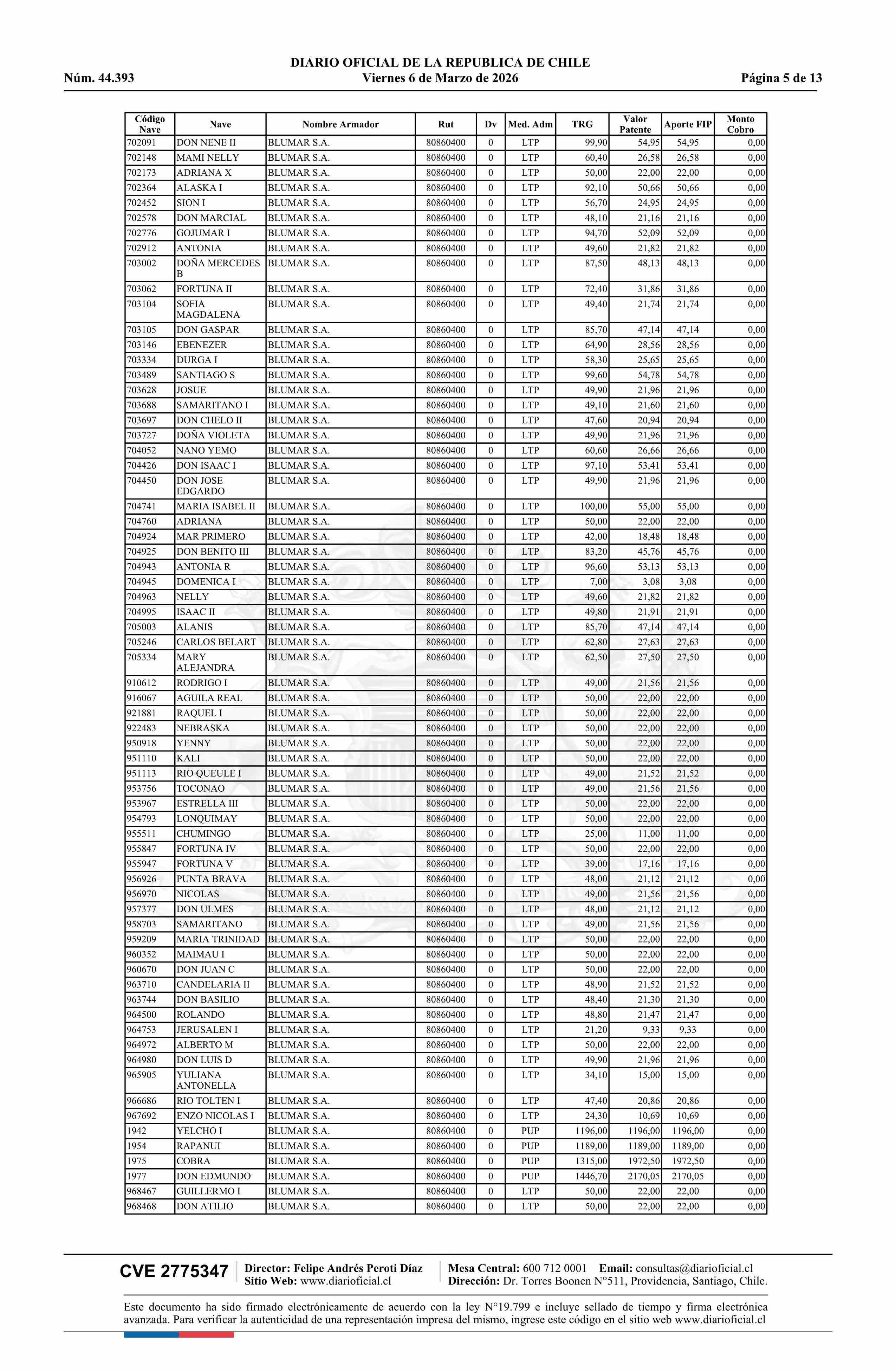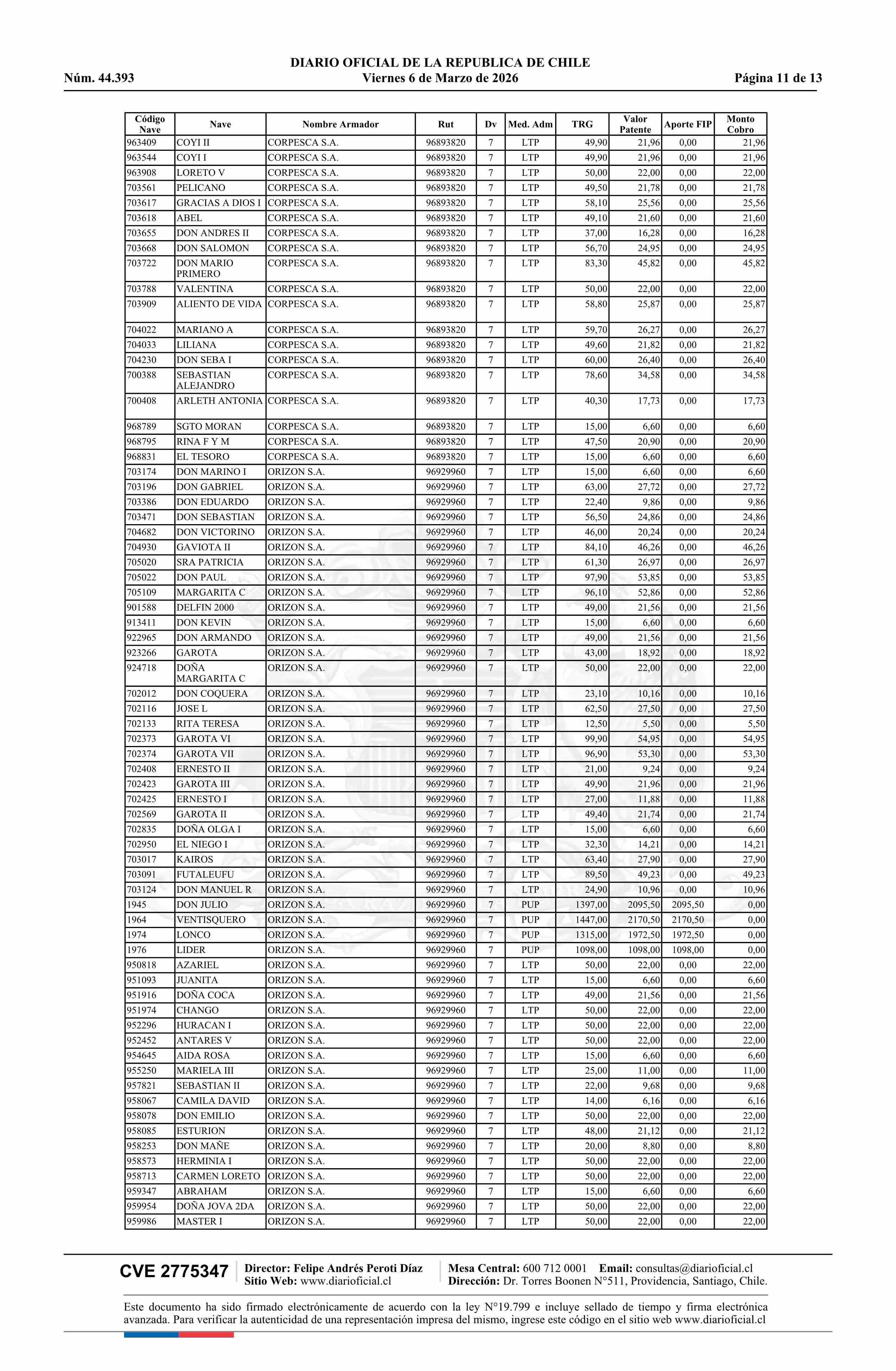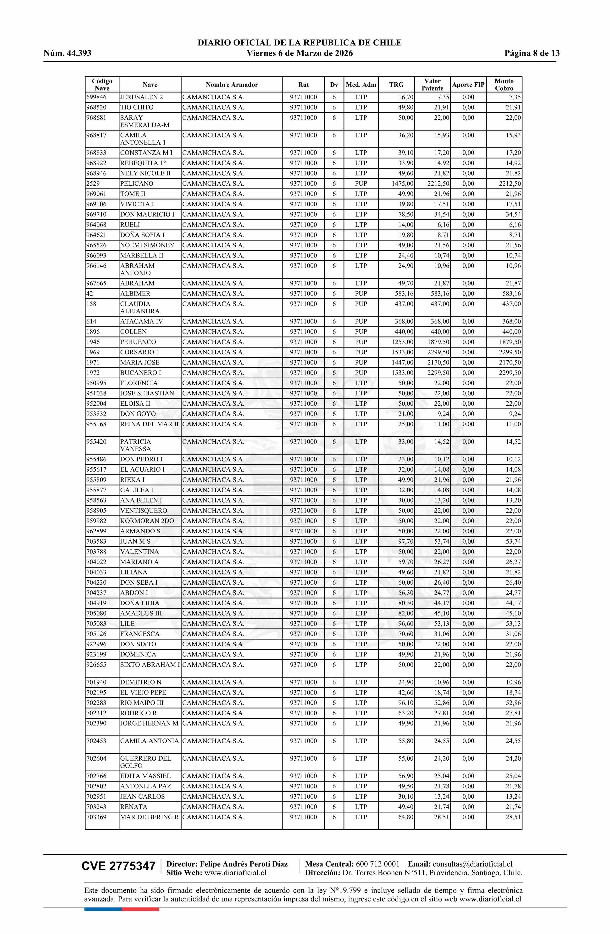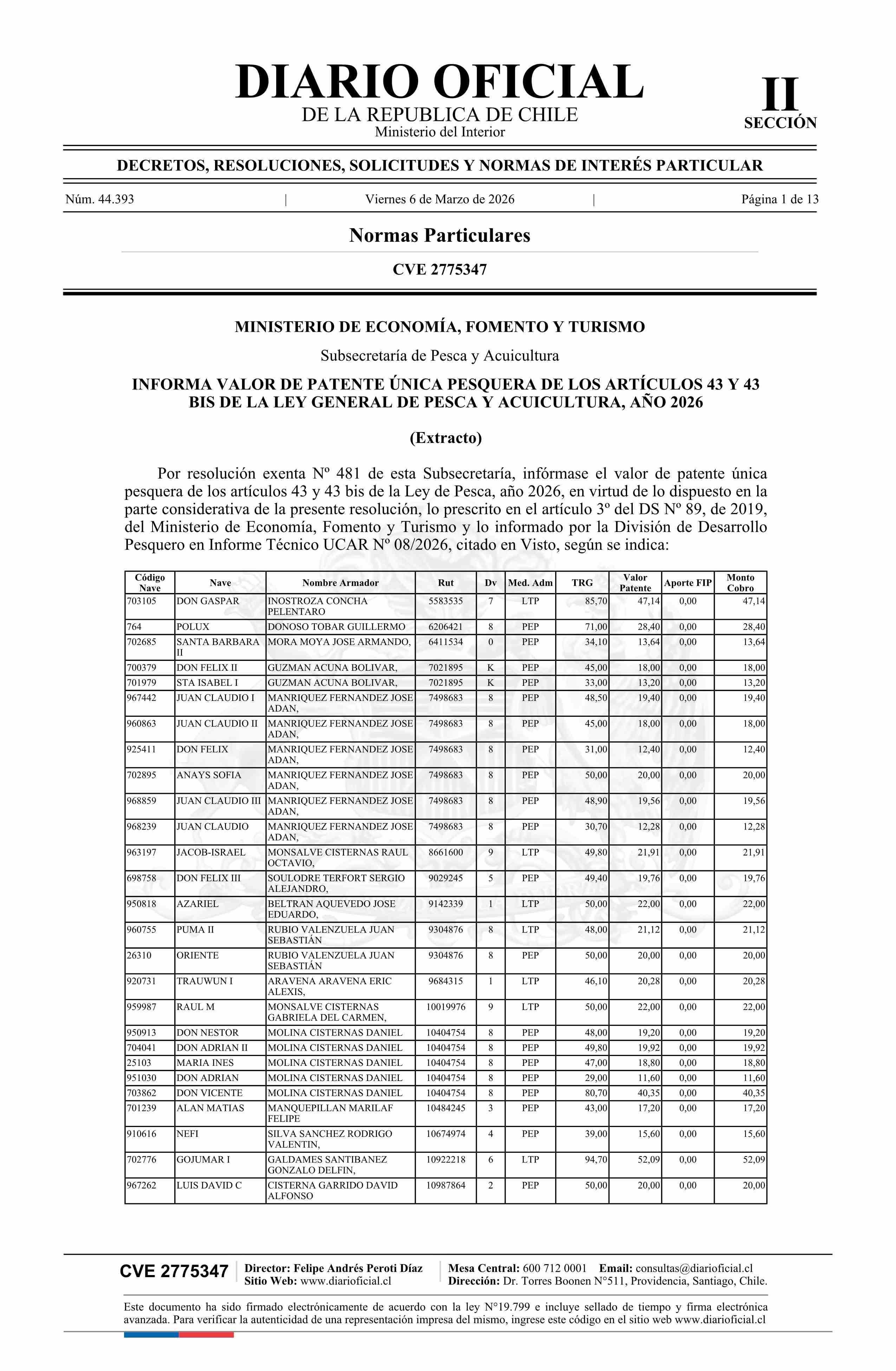 | Título: | Extracto de resolución exenta número 481, de 2026.- Informa valor de patente única pesquera de los artículos 43 y 43 bis de la Ley General de Pesca y Acuicultura, año 2026 |