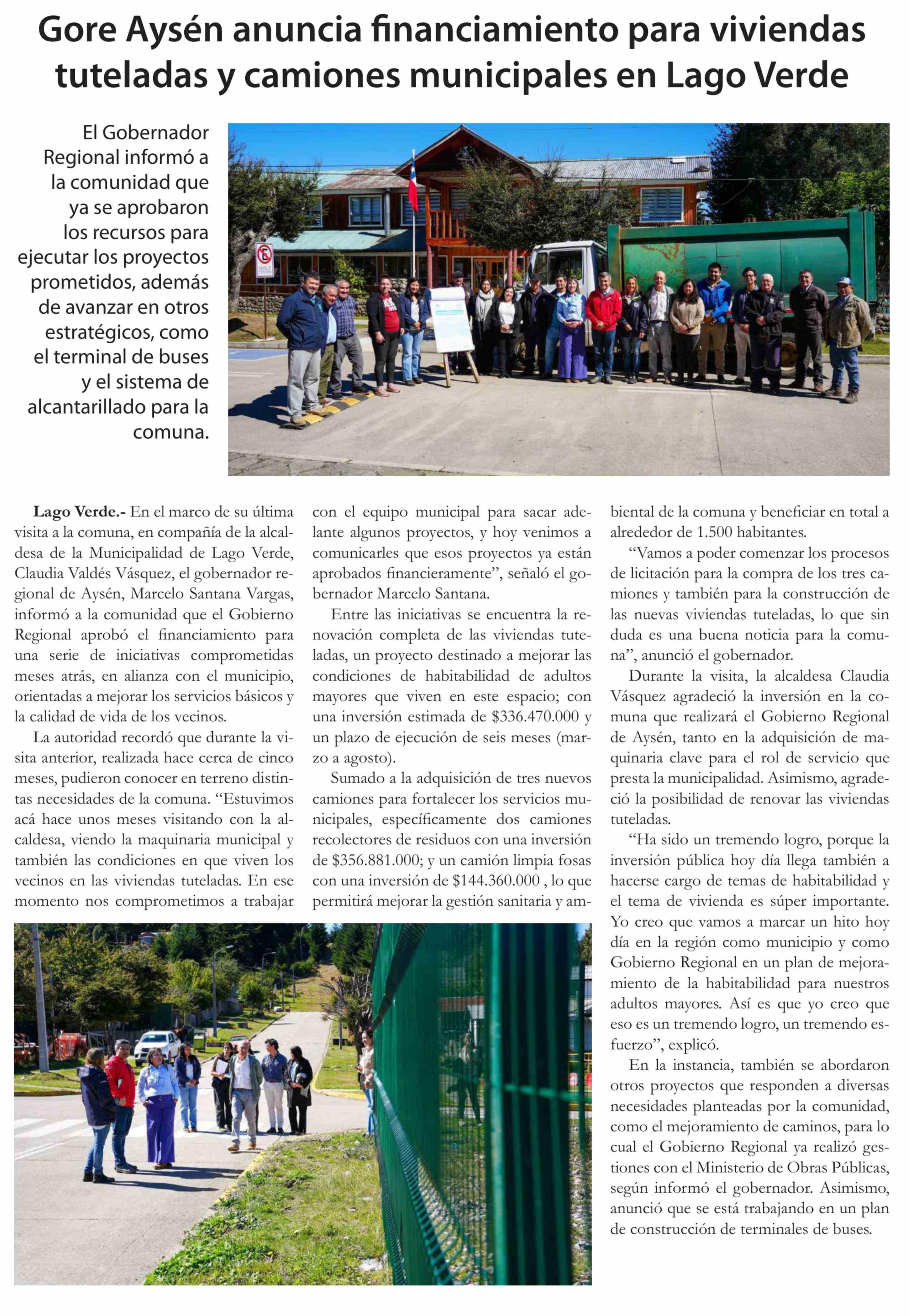 Gore Aysén anuncia financiamiento para viviendas tuteladas y camiones municipales en Lago Verde