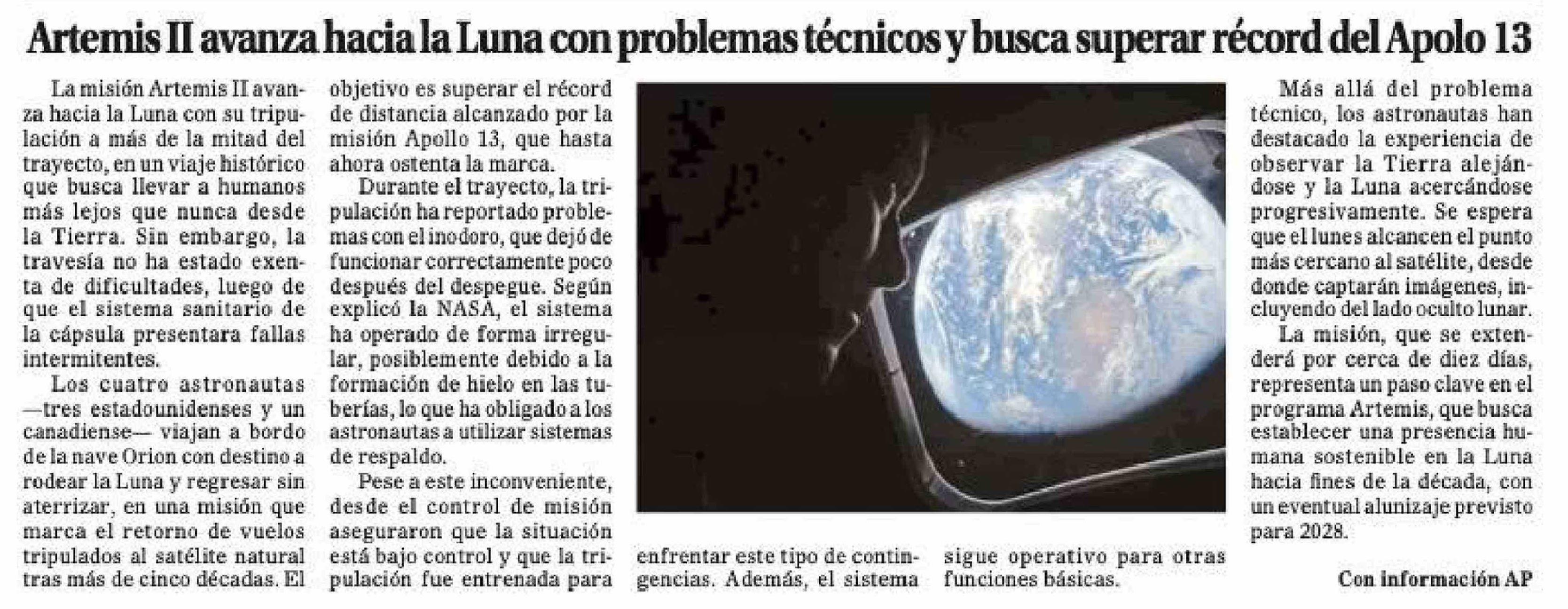 Artemis II avanza hacia la Luna con problemas técnicos y busca superar récord del Apolo 13