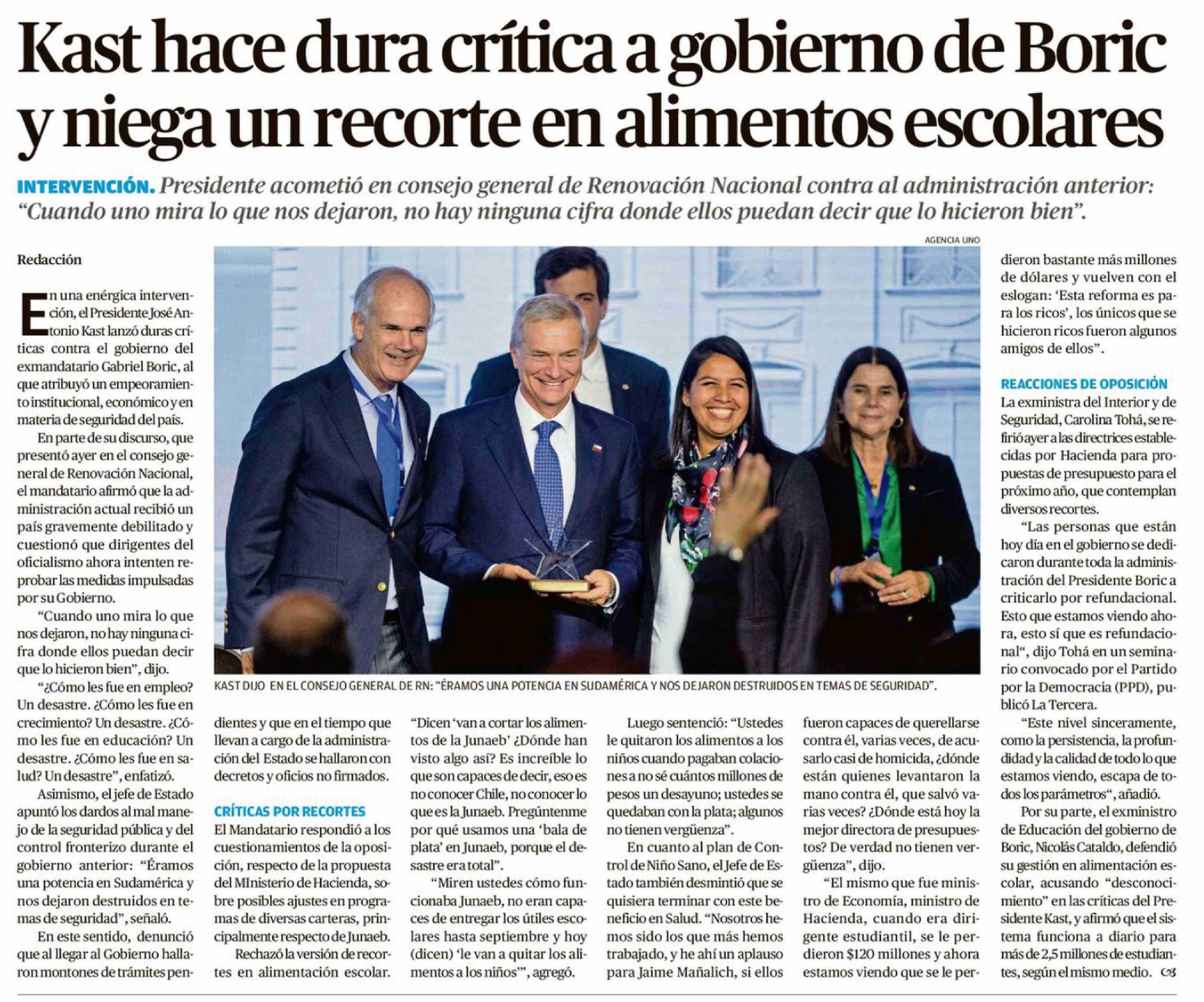 Kast hace dura crítica a gobierno de Boric y niega un recorte en alimentos escolares