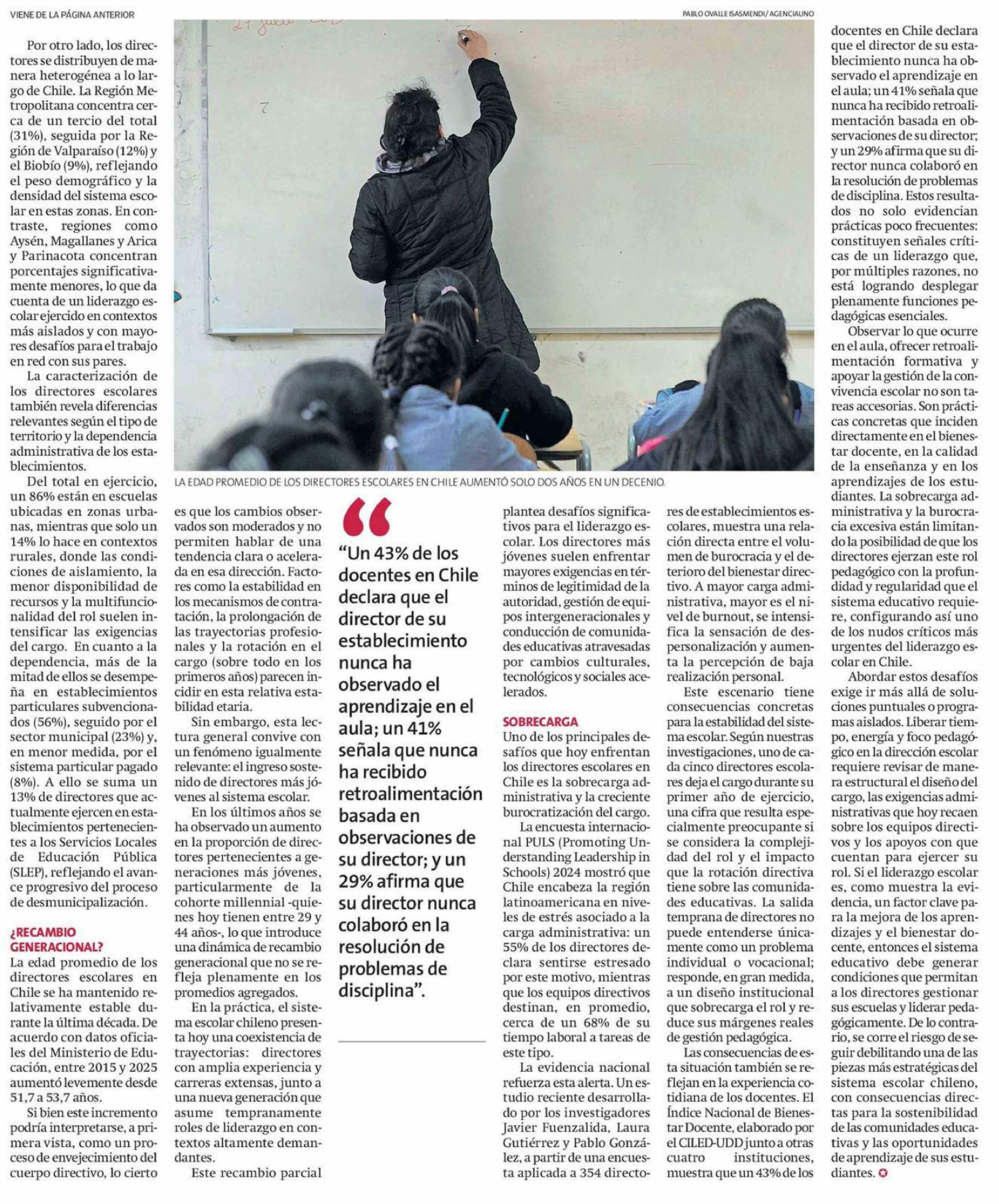 | Título: | Por otro lado, los directores se distribuyen de manera heterogénea a lo largo de Chile. La Región Metropolitana concentra cerca de un tercio del total (31%), seguida por la Región de Valparaíso (12%) y el Biobío (9%), reflejando el peso demográfico y la densidad del sistema escolar en estas zonas. E |