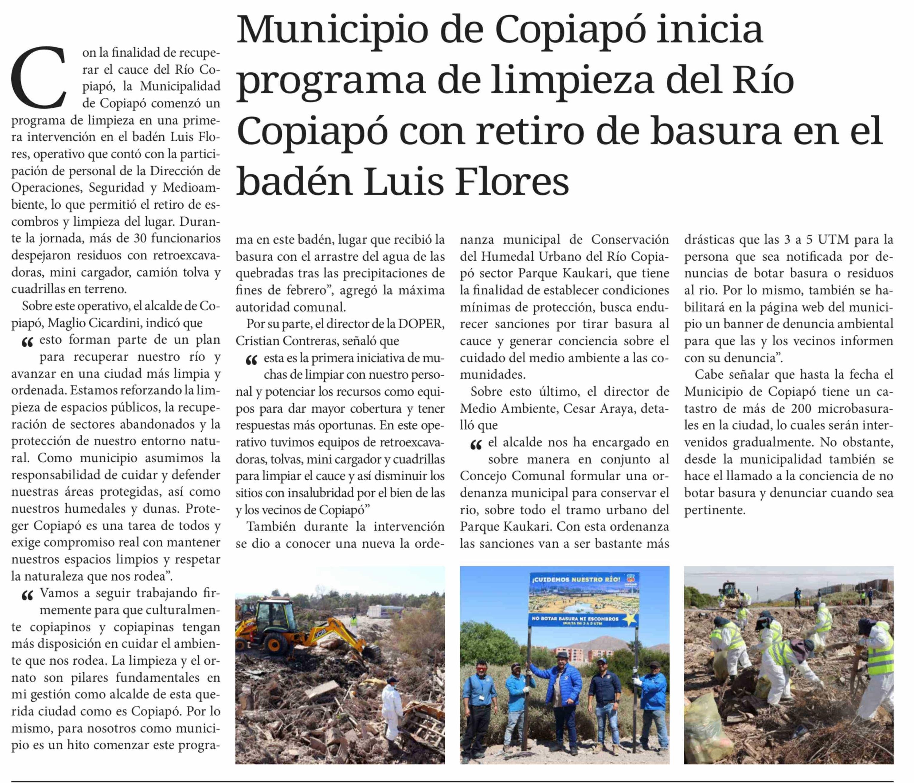 Municipio de Copiapó inicia programa de limpieza del Río Copiapó con retiro de basura en el badén Luis Flores