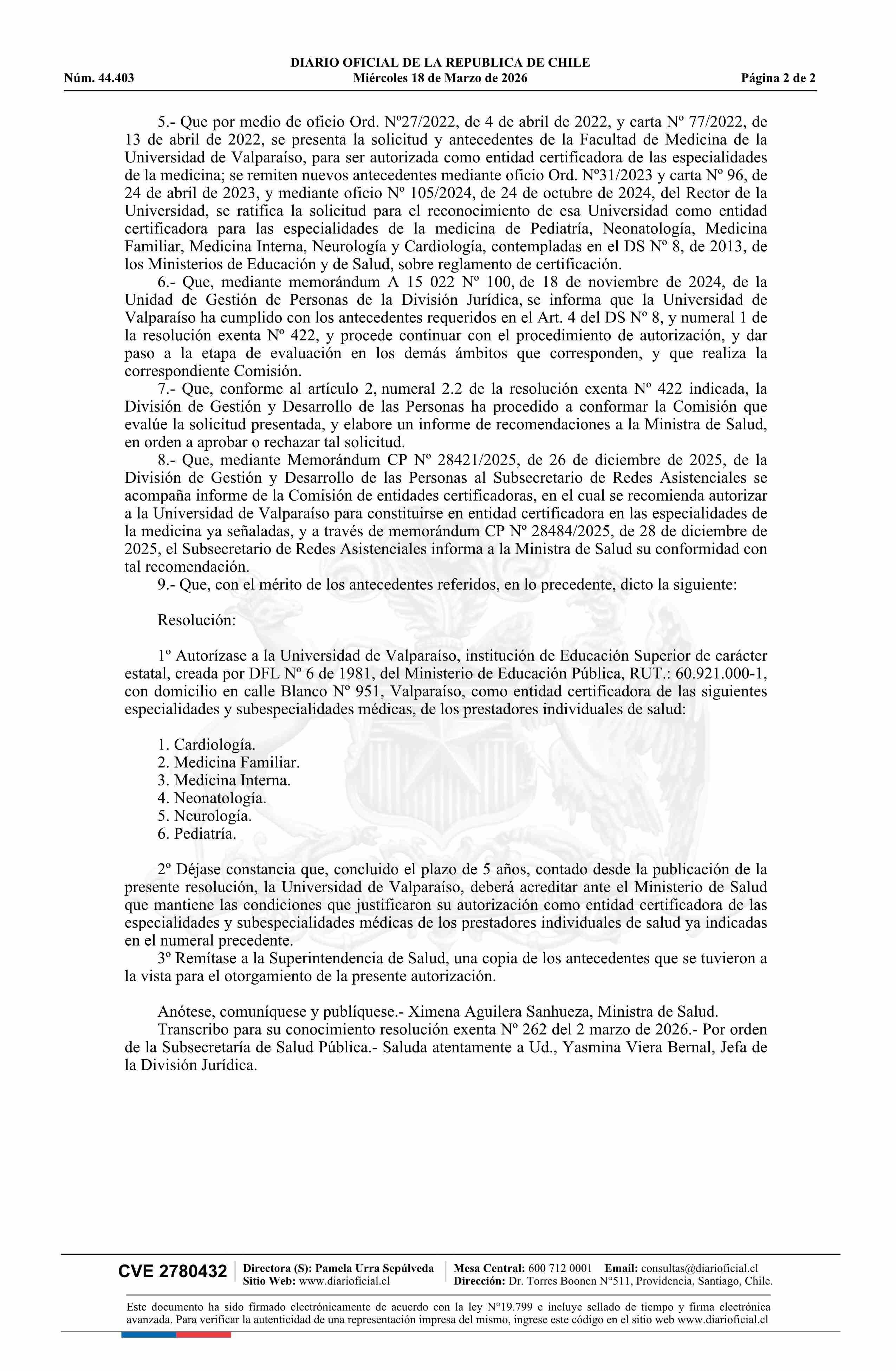 | Título: | Resolución exenta número 262, de 2026.- Autoriza a la Universidad de Valparaíso como entidad certificadora de las especialidades que indica |