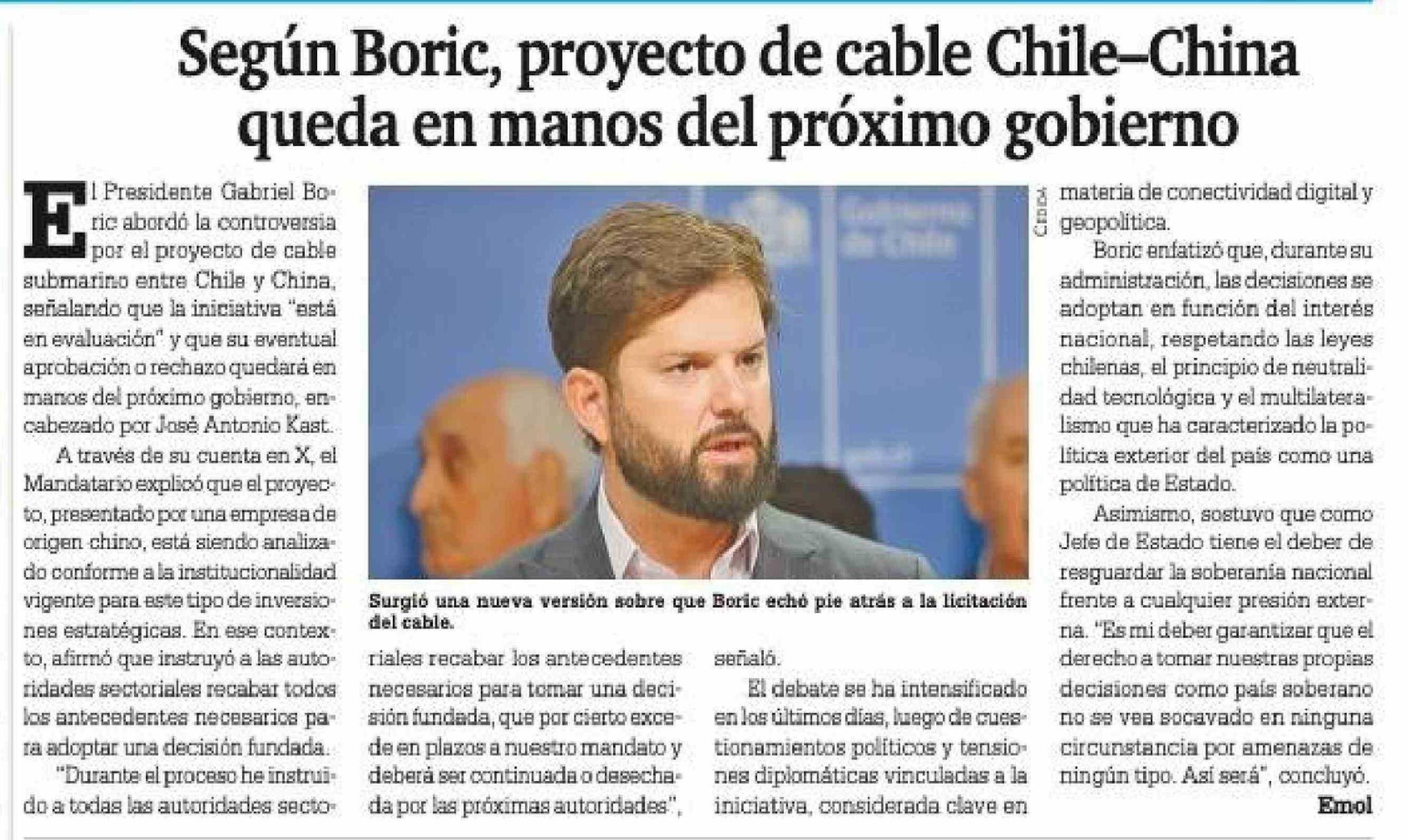Según Boric, proyecto de cable Chile-China queda en manos del próximo gobierno