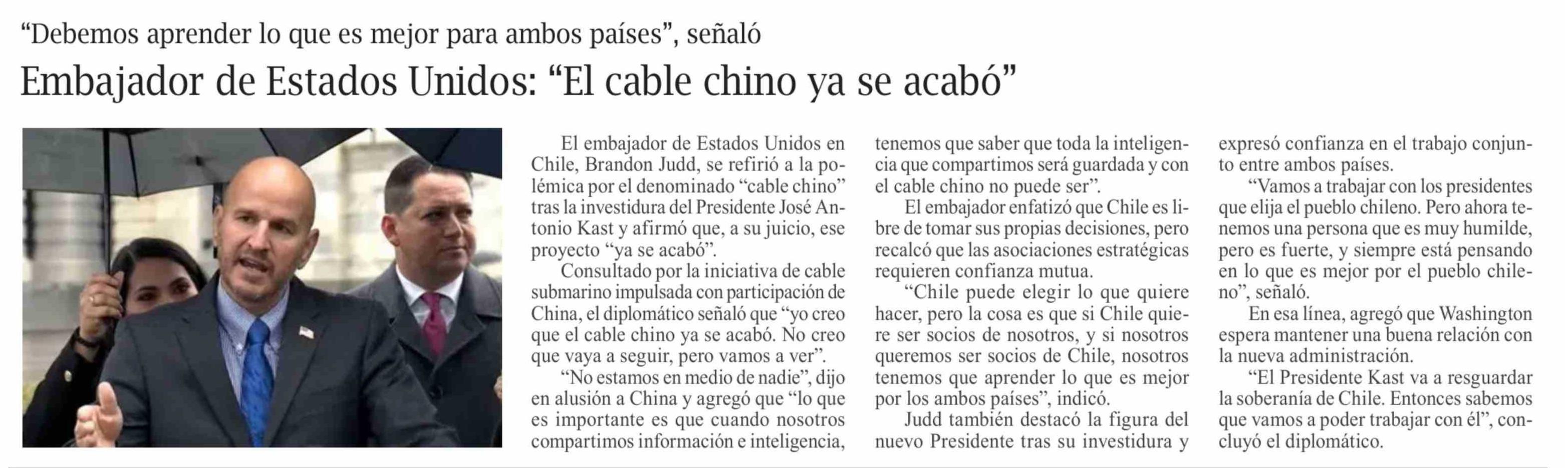 Embajador de Estados Unidos: "El cable chino ya se acabó"