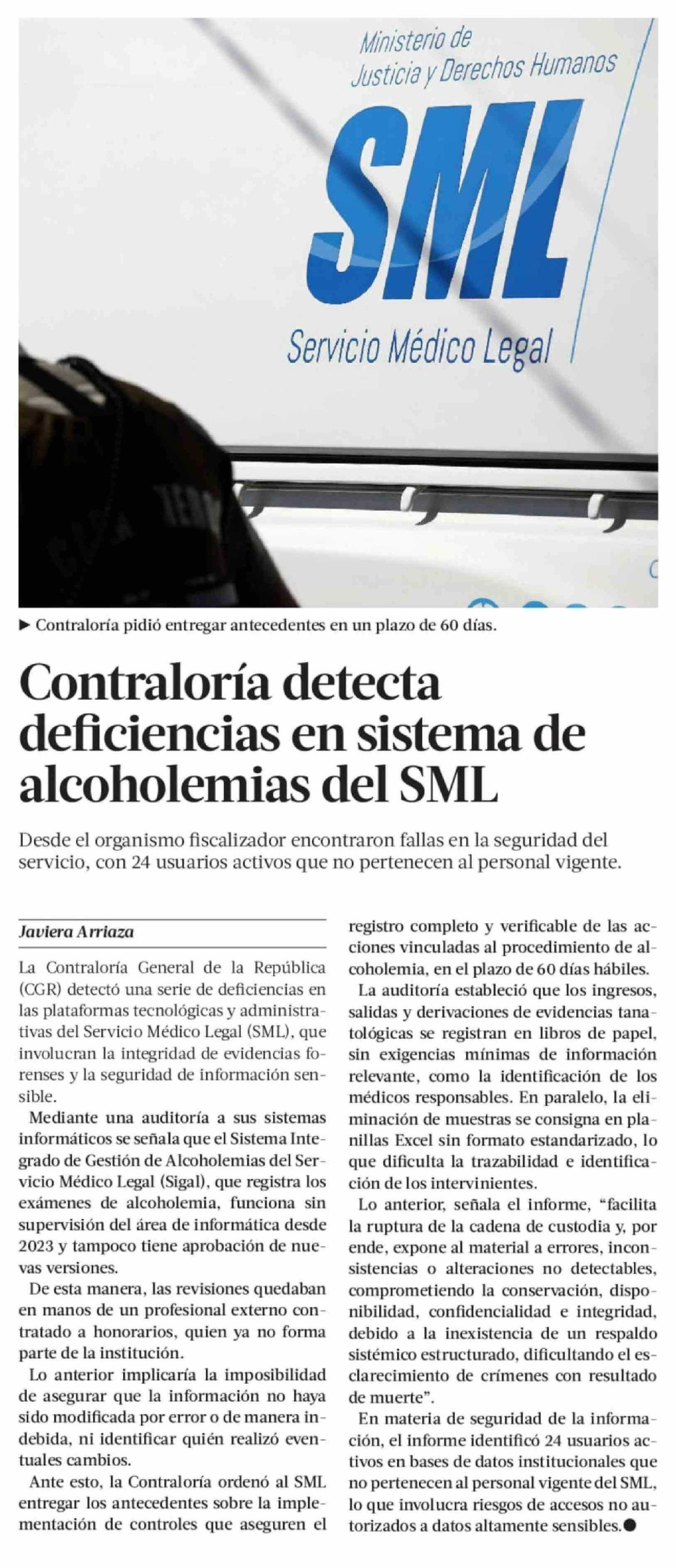 Contraloría detecta deficiencias en sistema de alcoholemias del SML
