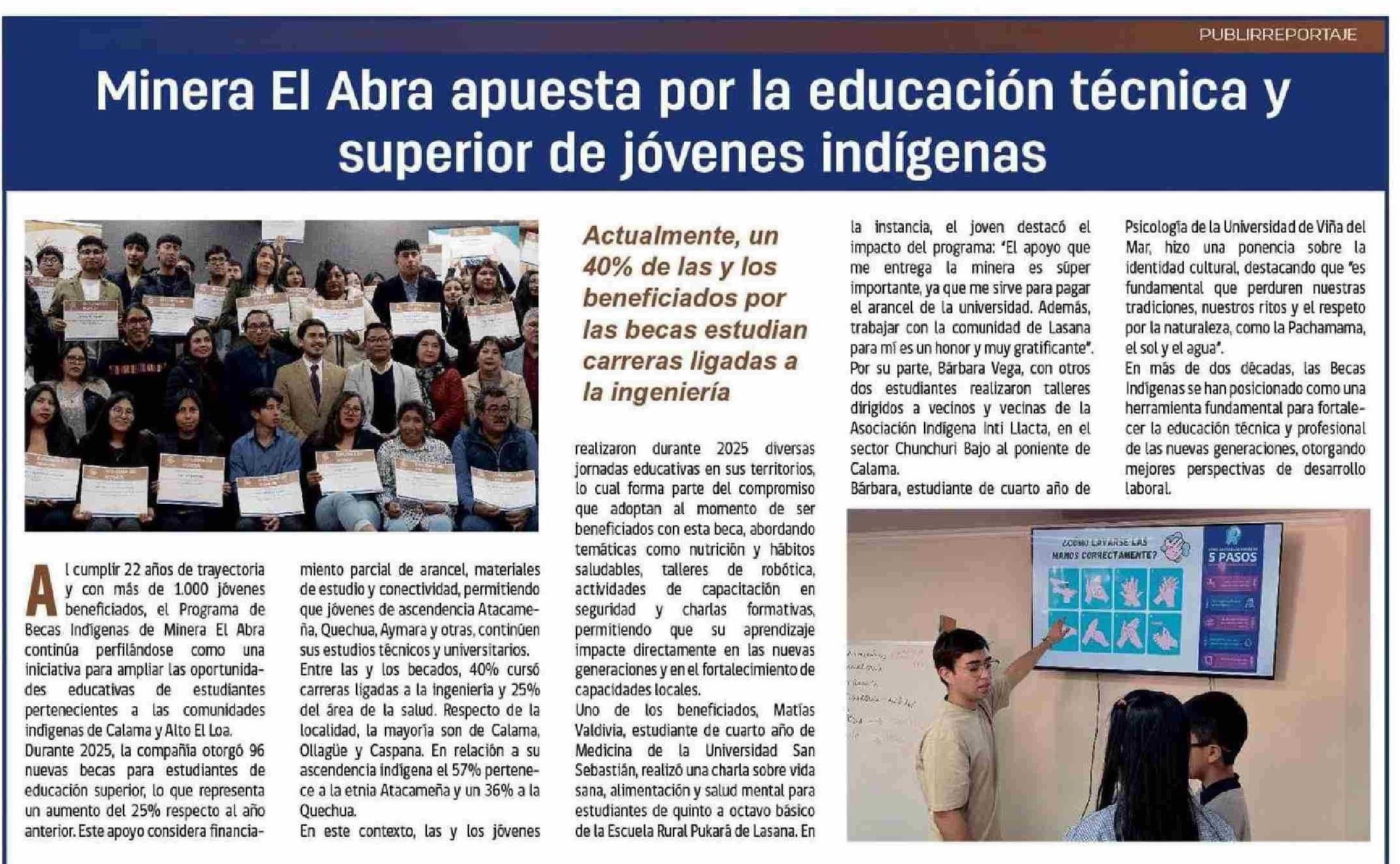 Título: Becas Indígenas de Minera El Abra continúa perfilándose como una iniciativa para ampliar las oportunida des educativas de estudiantes pertenecientes a las comunidades indigenas de Calama y Alto El Loa. Durante 2025, la compañía otorgó 96 nuevas becas para estudiantes de educación superior, lo que re