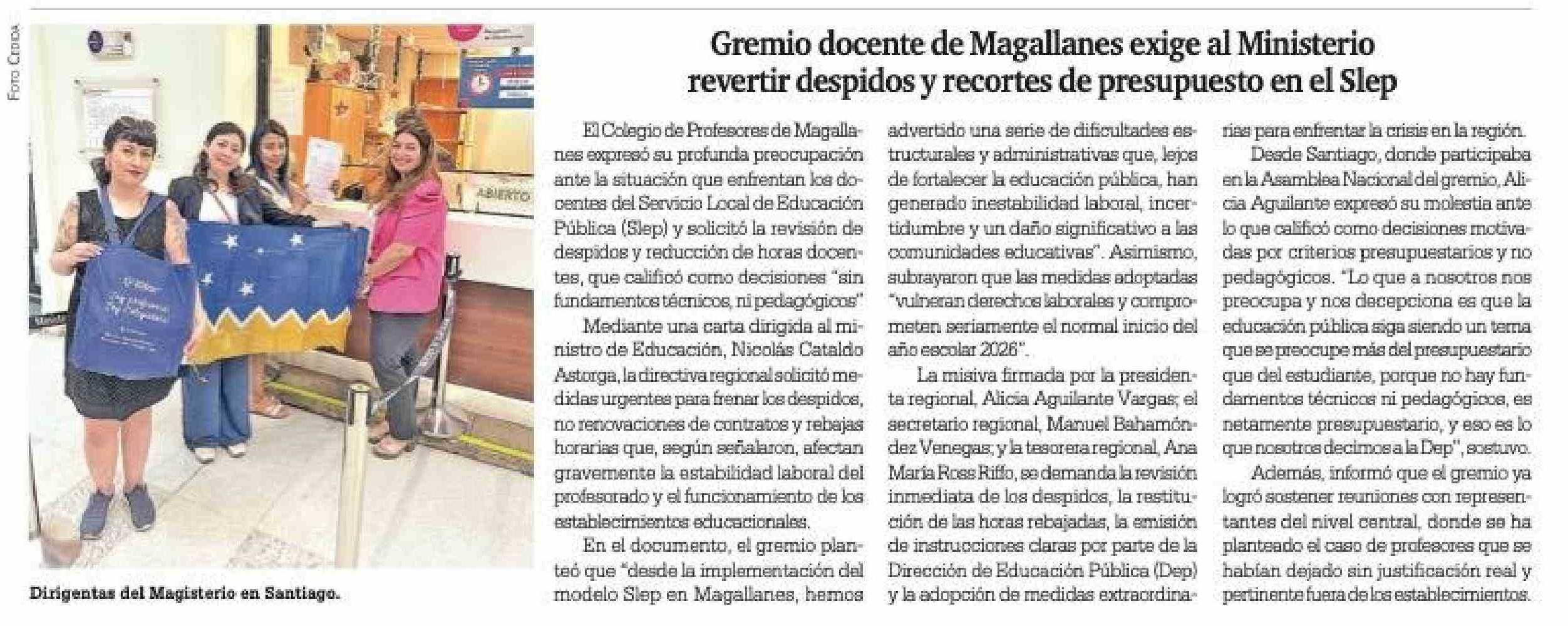 Gremio docente de Magallanes exige al Ministerio revertir despidos y recortes de presupuesto en el Slep
