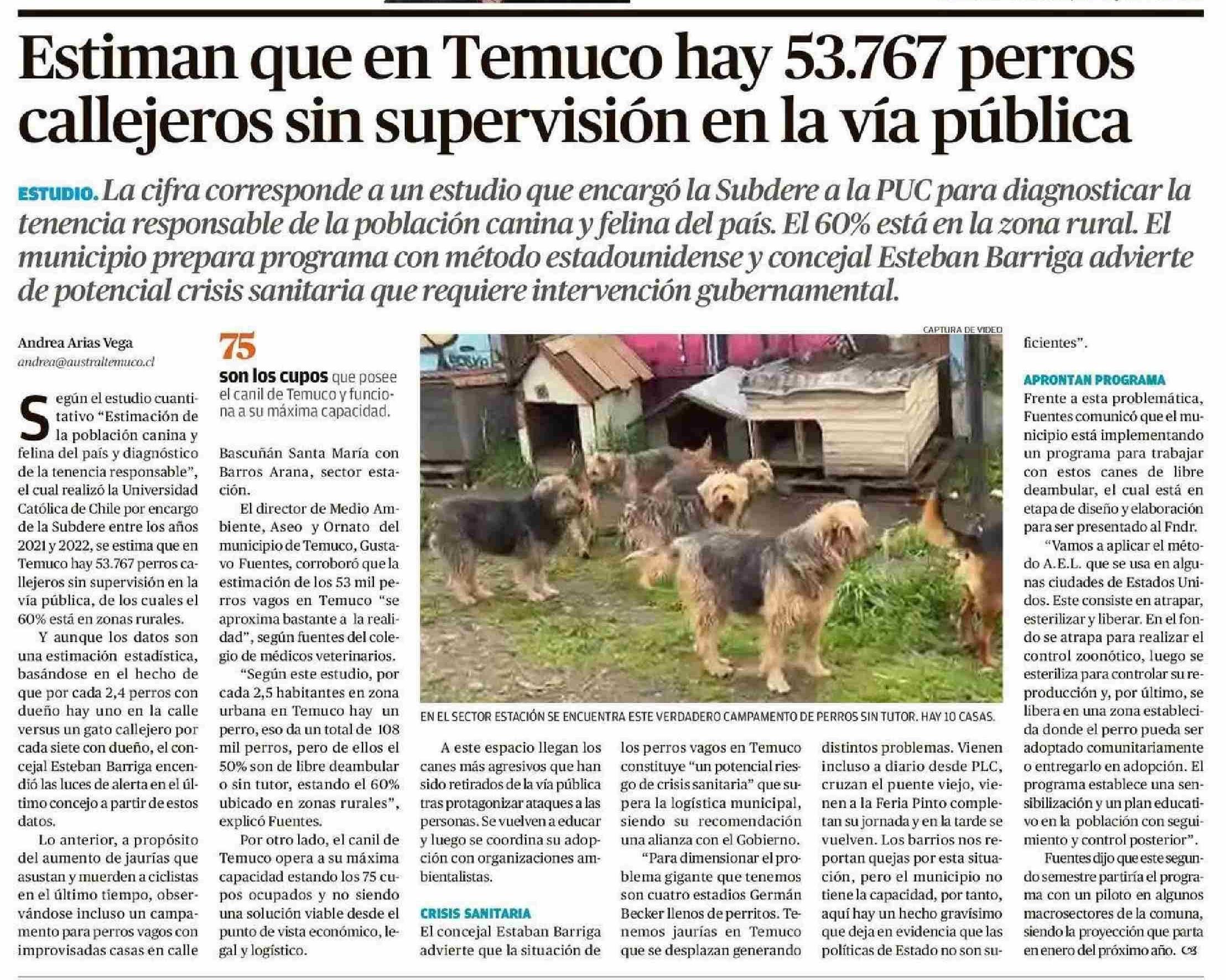 Estiman que en Temuco hay 53.767 perros callejeros sin supervisión en la vía pública
