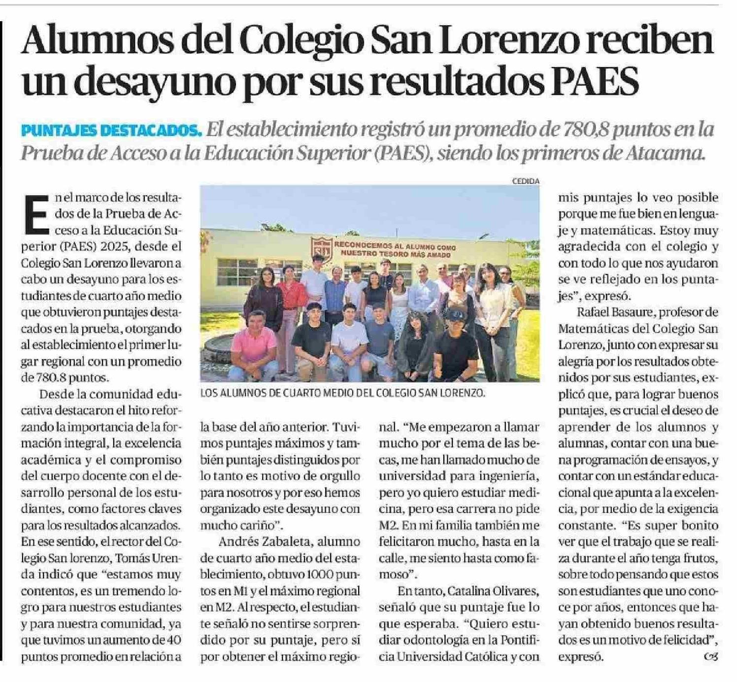 Alumnos del Colegio San Lorenzo reciben un desayuno por sus resultados PAES