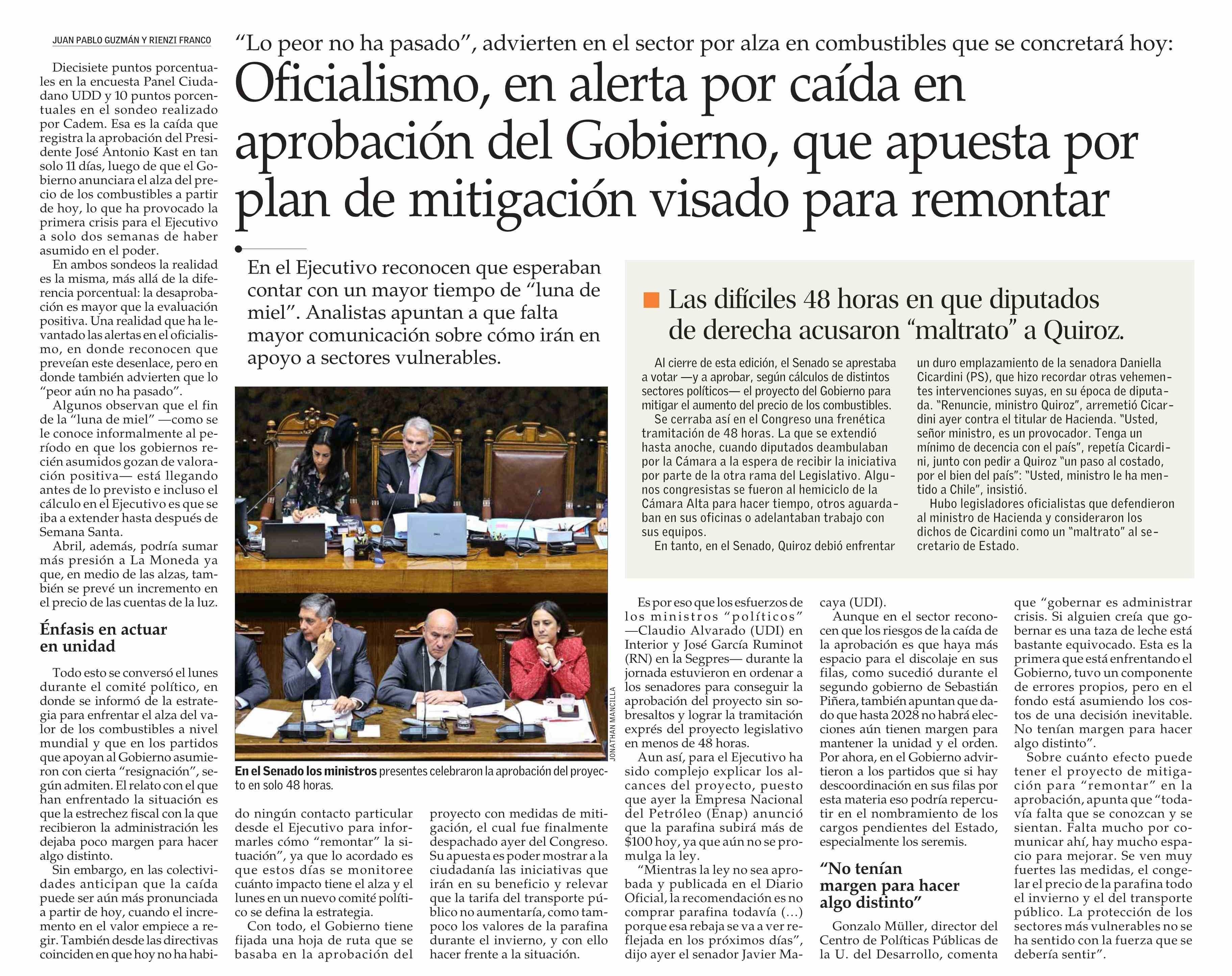 Oficialismo, en alerta por caída en aprobación del Gobierno, que apuesta por plan de mitigación visado para remontar