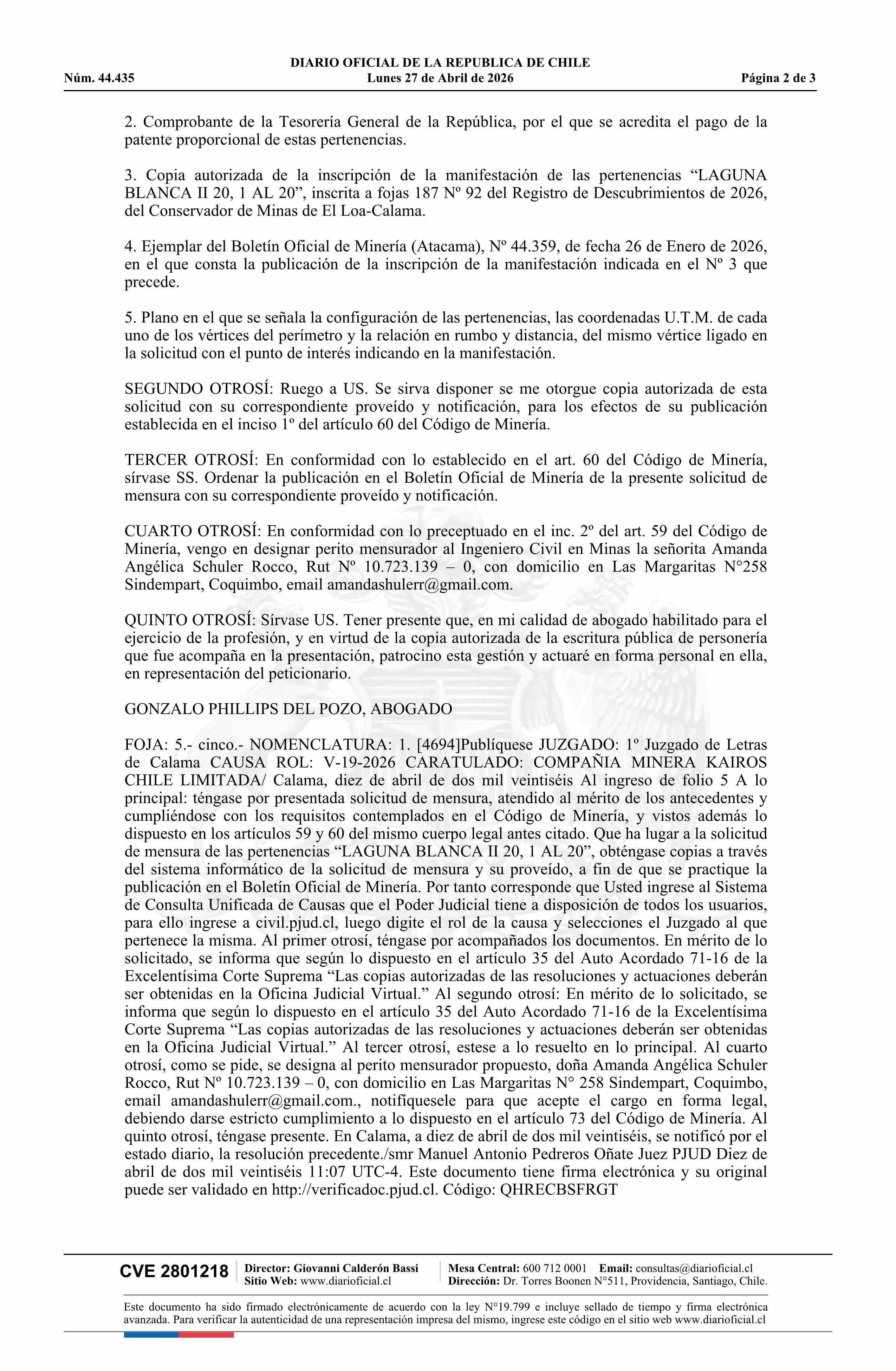 | Título: | LAGUNA BLANCA II 20, 1 AL 20 / Compañía Minera Kairos Chile Limitada |