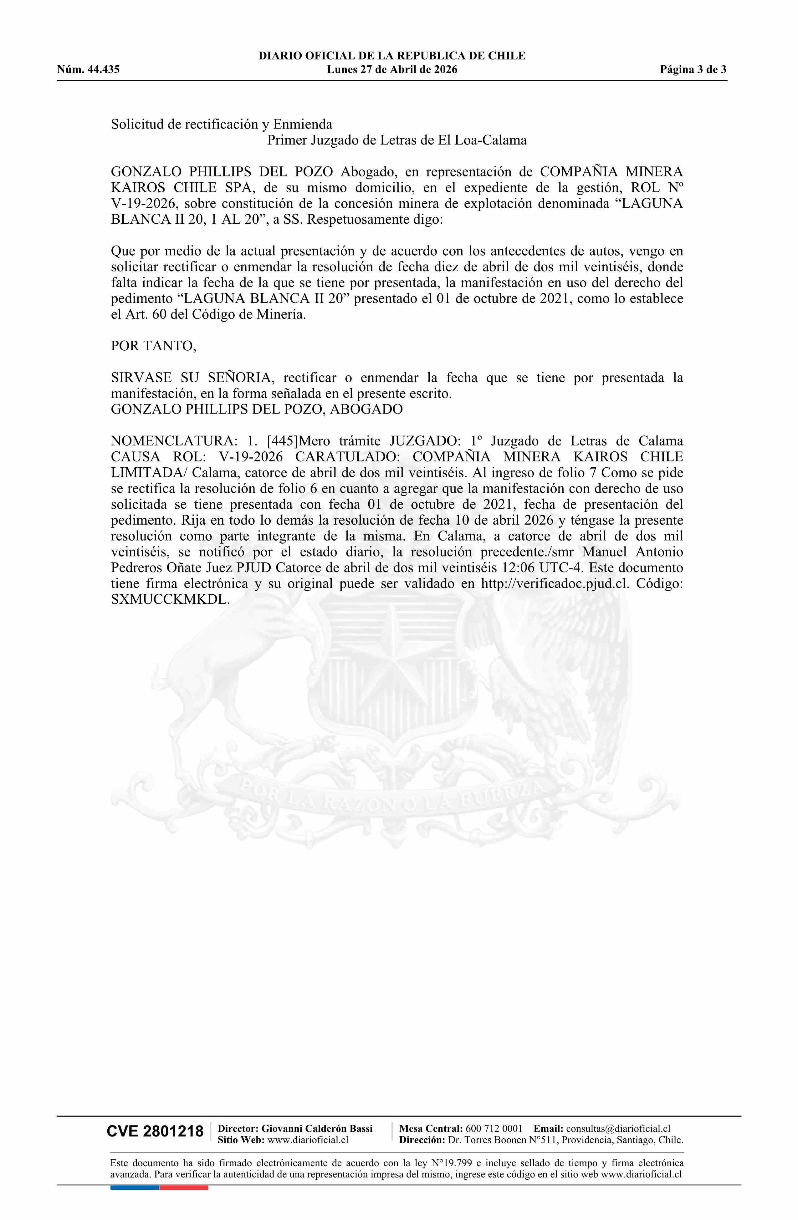 | Fuente: | DIARIO OFICIAL CHILE - BOLETÍN OFICIAL DE MINERÍA (DIARIO OFICIAL CHILE – BOM – SOLICITUDES DE MENSUR) | Página(s): | 13-15 |