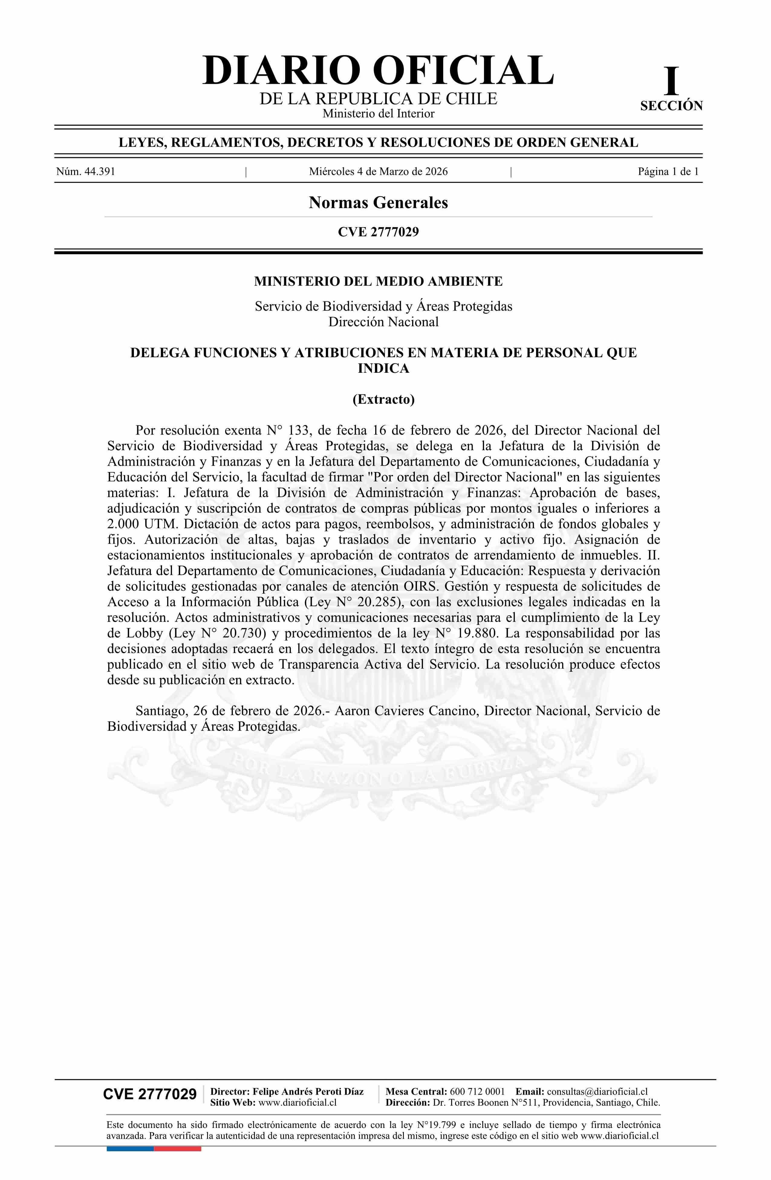 | Título: | Extracto de resolución exenta número 133, de 2026.- Delega funciones y atribuciones en materia de personal que indica |