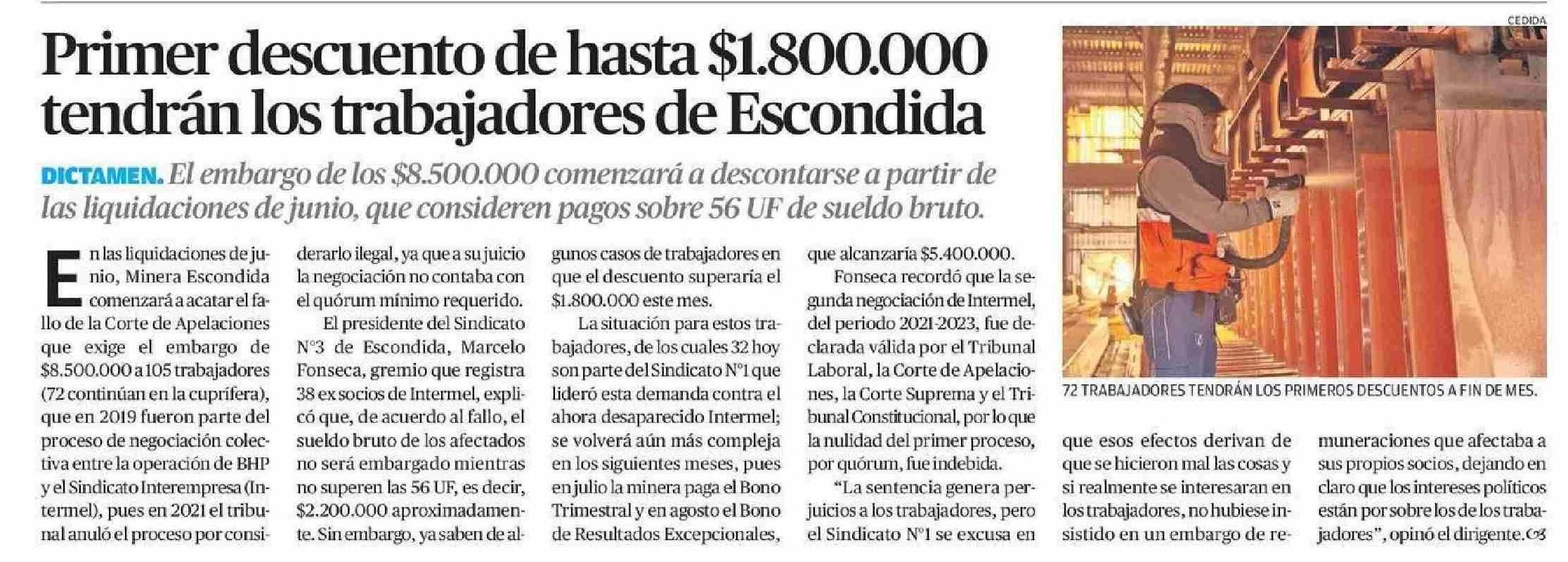 Primer descuento de hasta $1.800.000 tendrán los trabajadores de Escondida