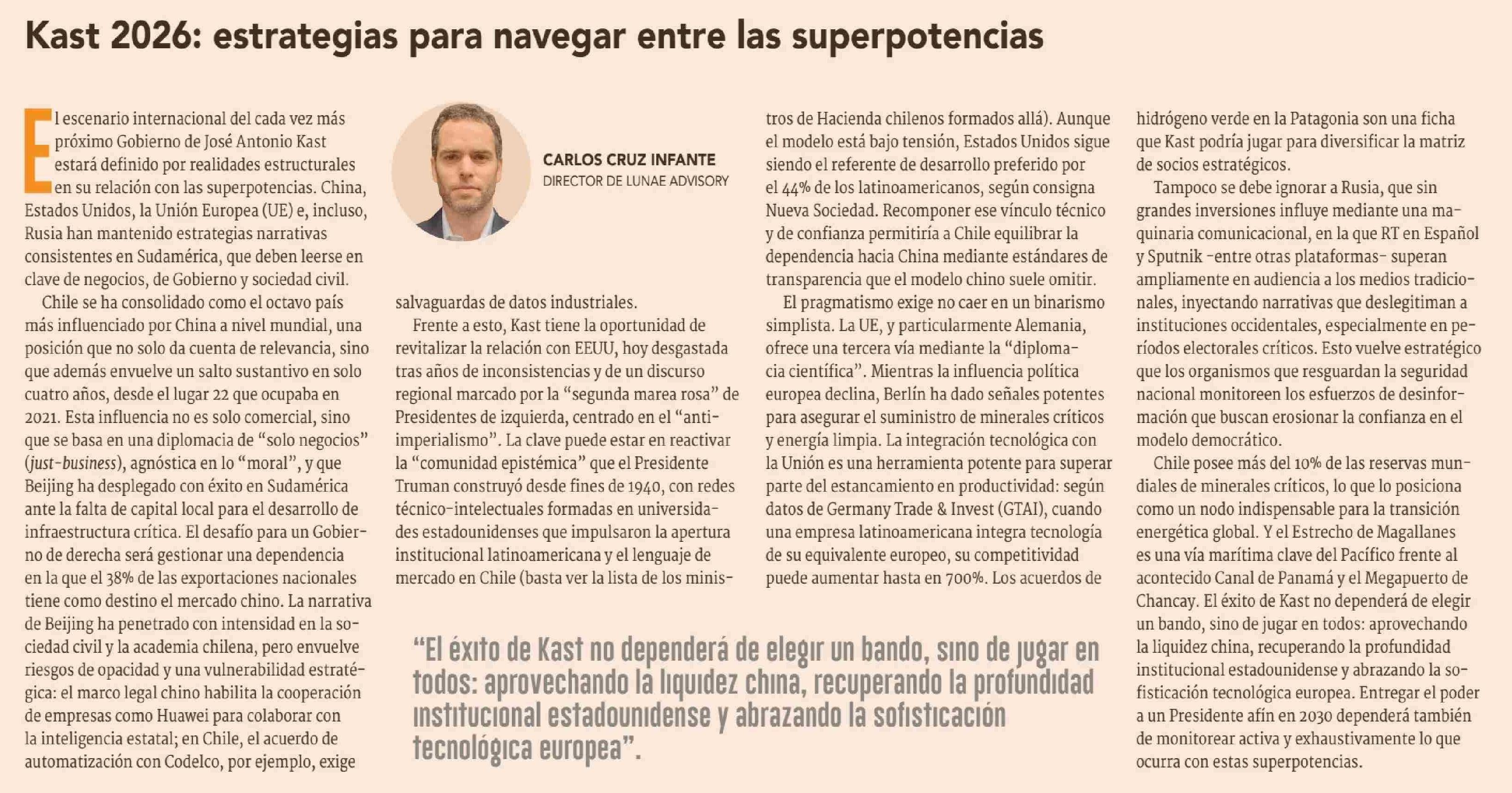 Columnas de Opinión: Kast 2026: estrategias para navegar entre las superpotencias