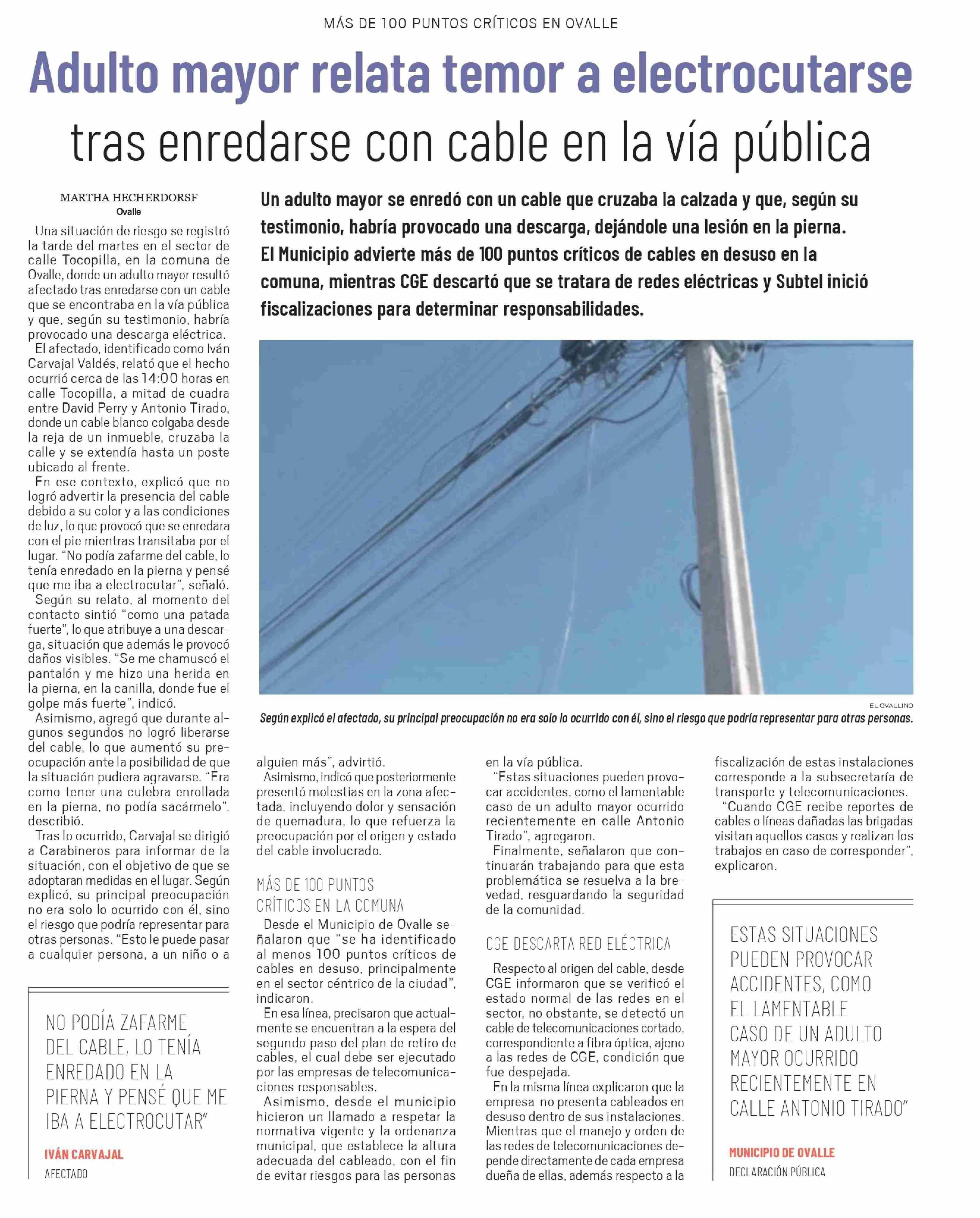 Adulto mayor relata temor a electrocutarse tras enredarse con cable en la vía pública