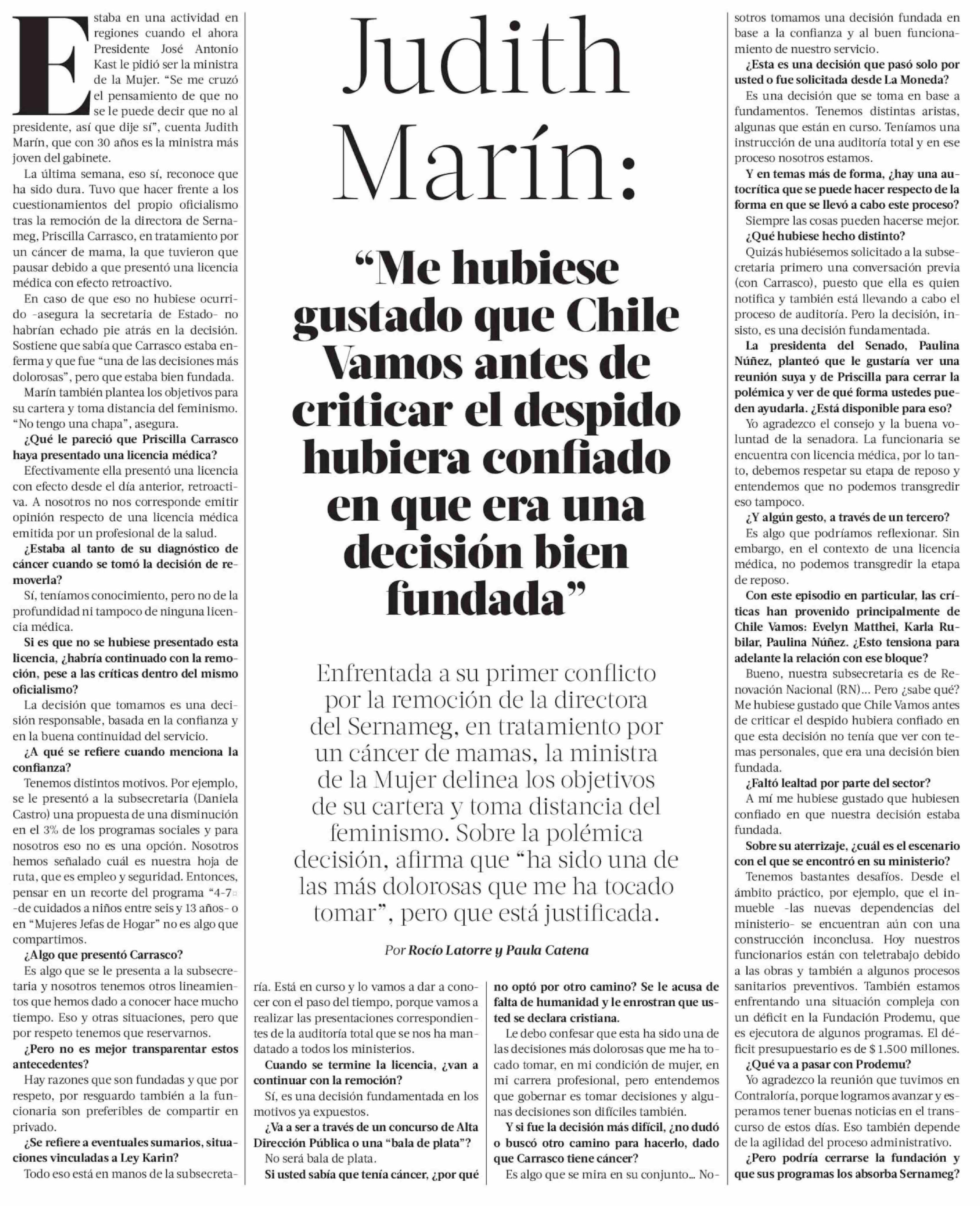 Título: Judith Marín "Me hubiese gustado que Chile Vamos antes de criticar el despido hubiera confiado en que era una decisión bien fundada"