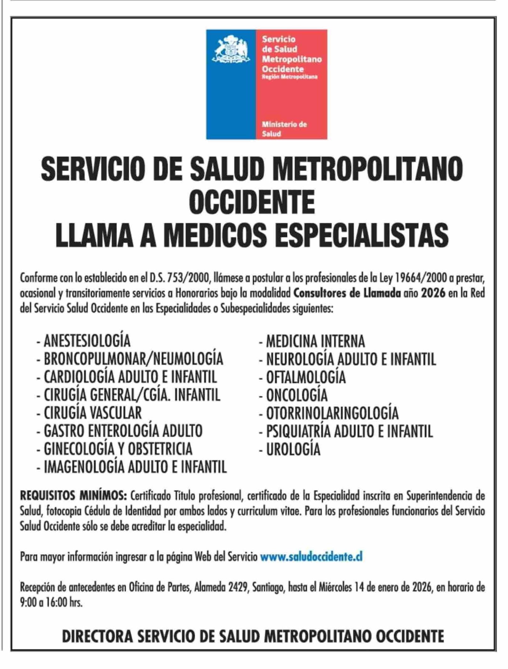 Aviso Licitaciones: Servicio de Salud Metropolitano Occidente Region Metropolitana
