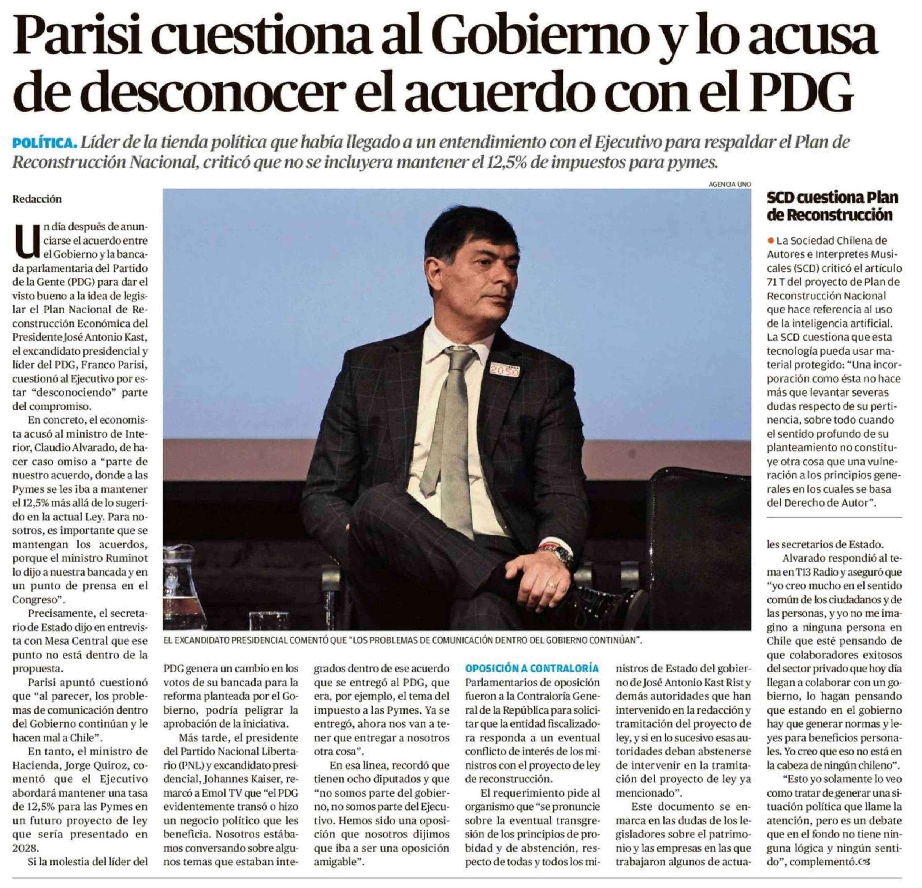 Parisi cuestiona al Gobierno y lo acusa de desconocer el acuerdo con el PDG