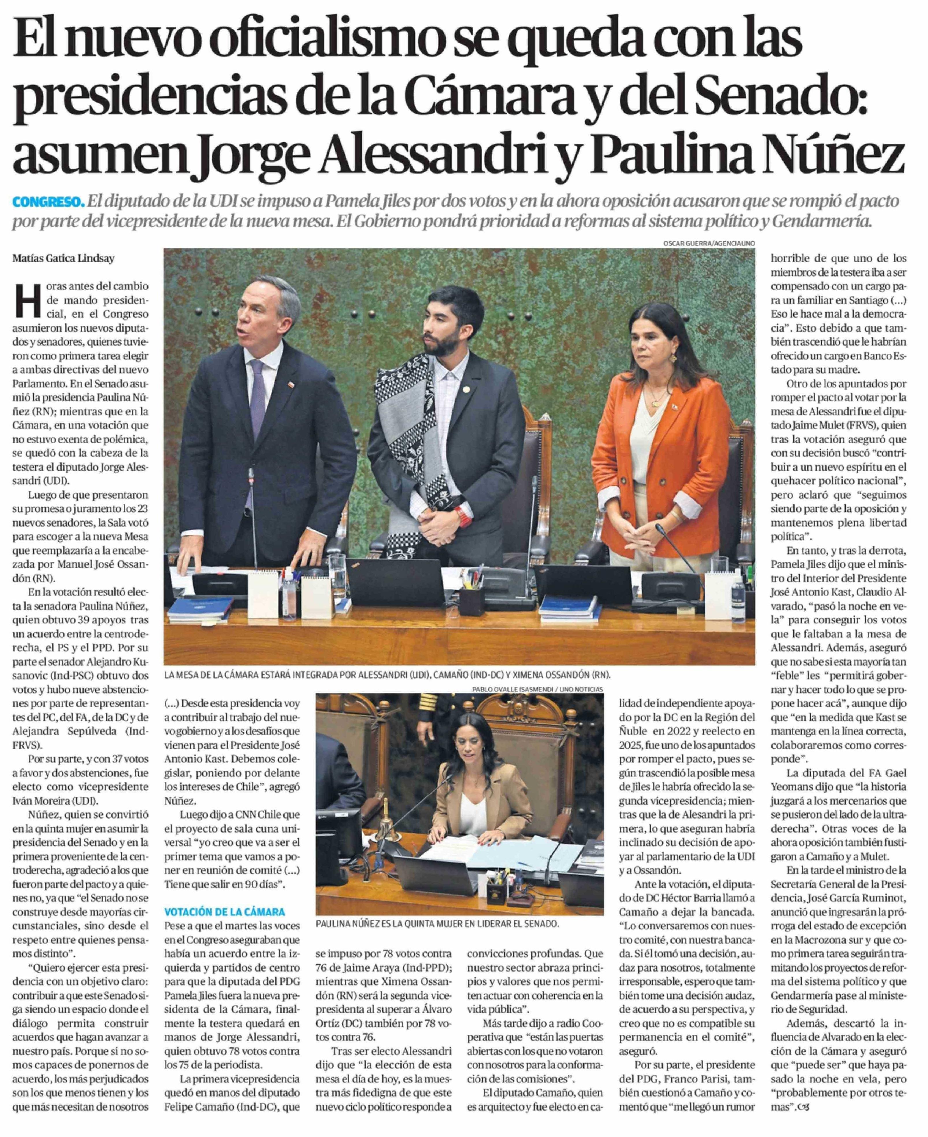 El nuevo oficialismo se queda con las presidencias de la Cámara y del Senado: asumen Jorge Alessandri y Paulina Núñez