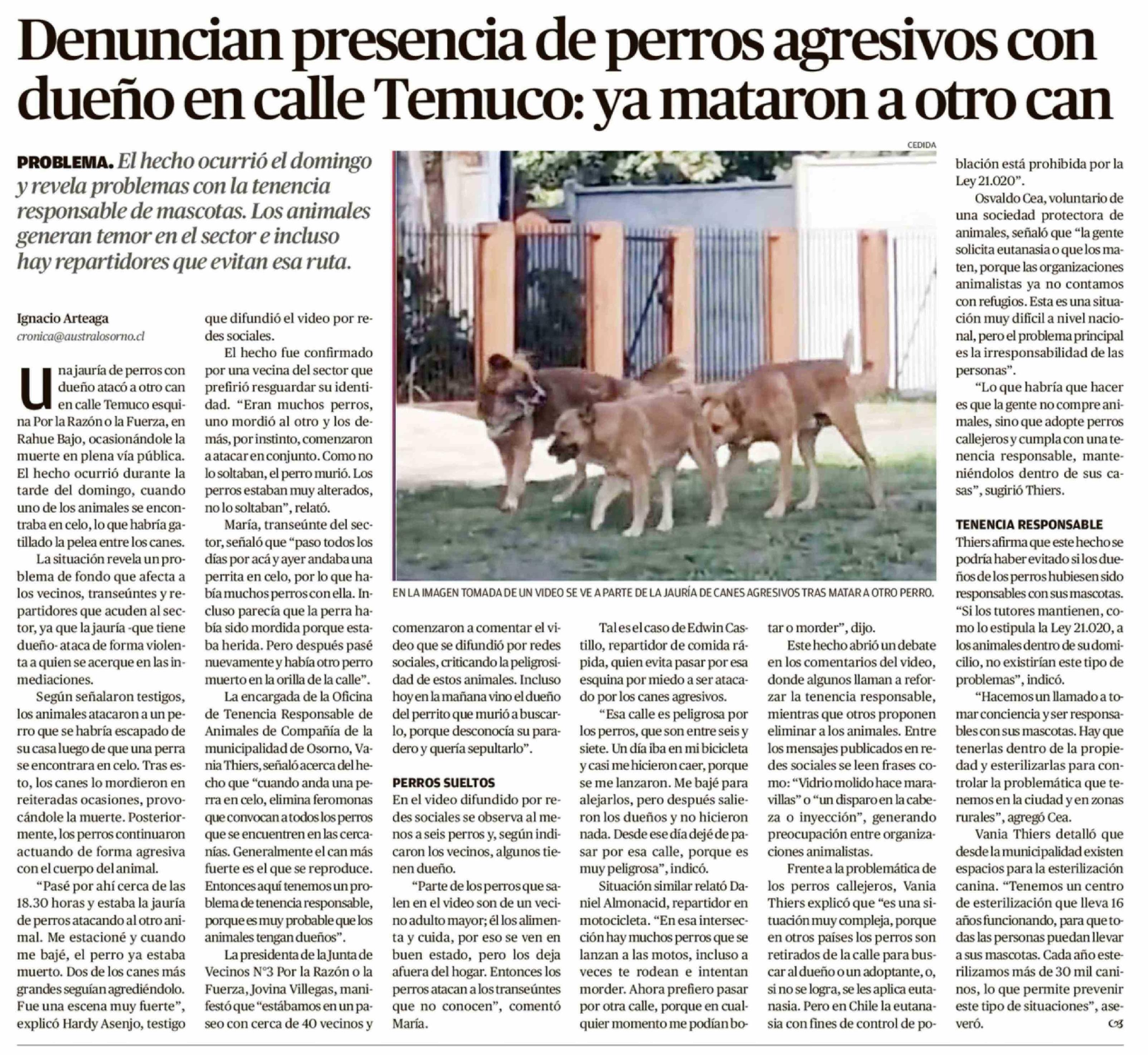 Denuncian presencia de perros agresivos con dueño en calle Temuco: ya mataron a otro can