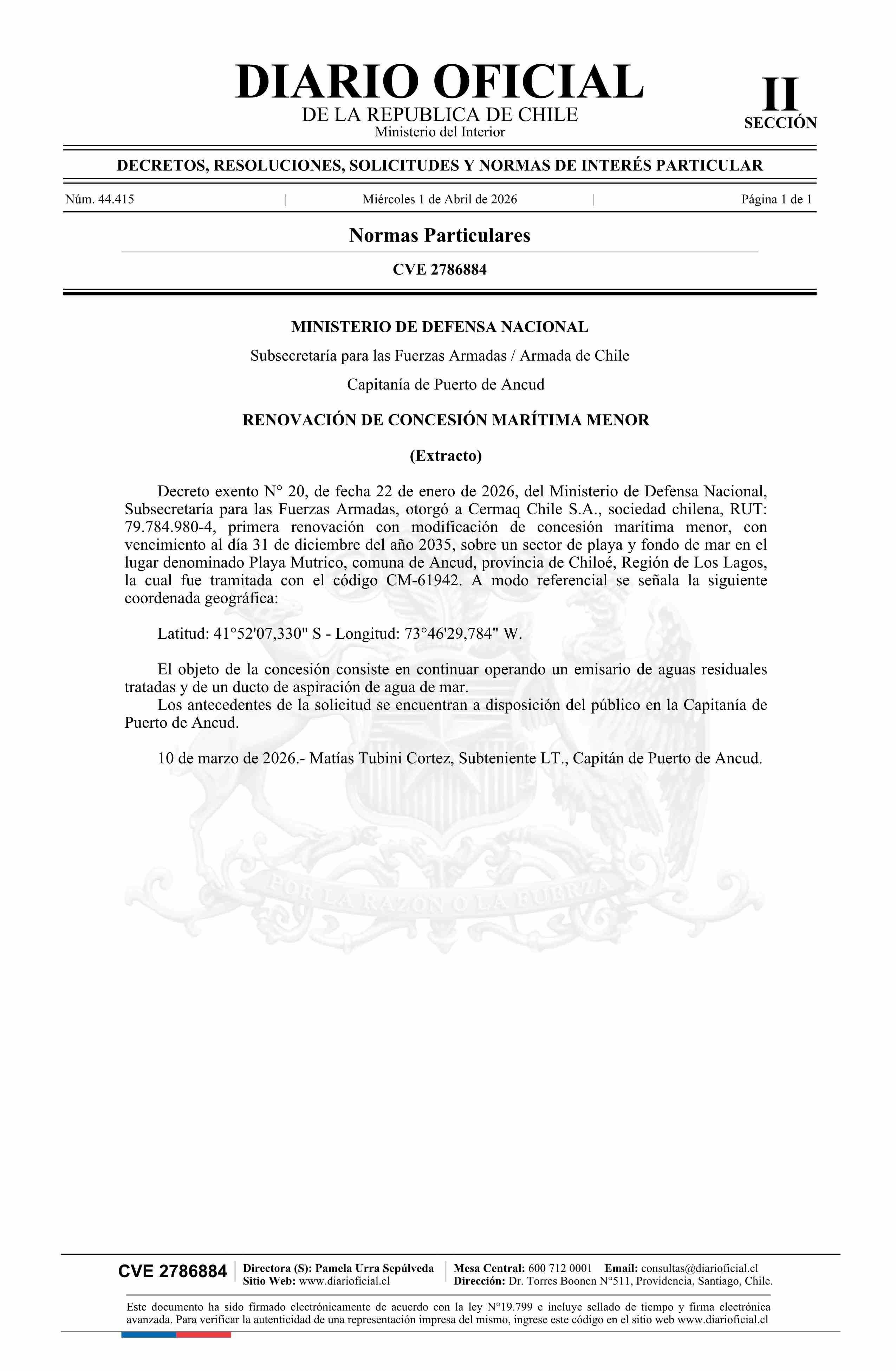 | Título: | Extracto de decreto exento número 20, de 2026.- Renovación de concesión marítima menor |