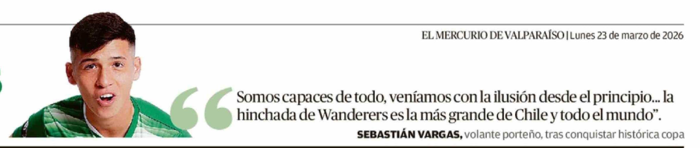 Título: Somos capaces de todo, veníamos con la ilusión desde el principio ... la hinchada de Wanderers es la más grande de Chile y todo el mundo". SEBASTIÁN VARGAS, volante porteño, tras conquistar histórica copa