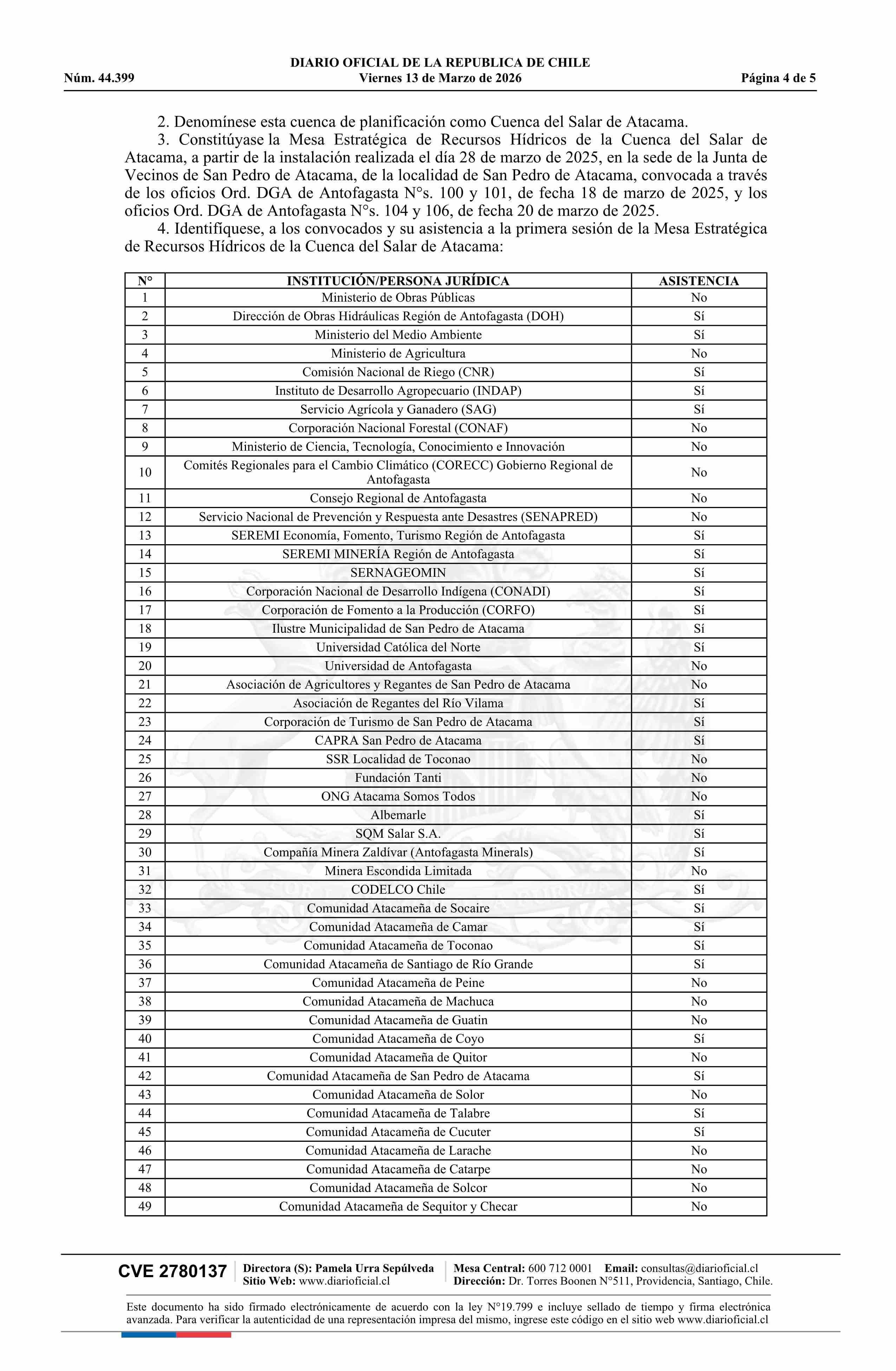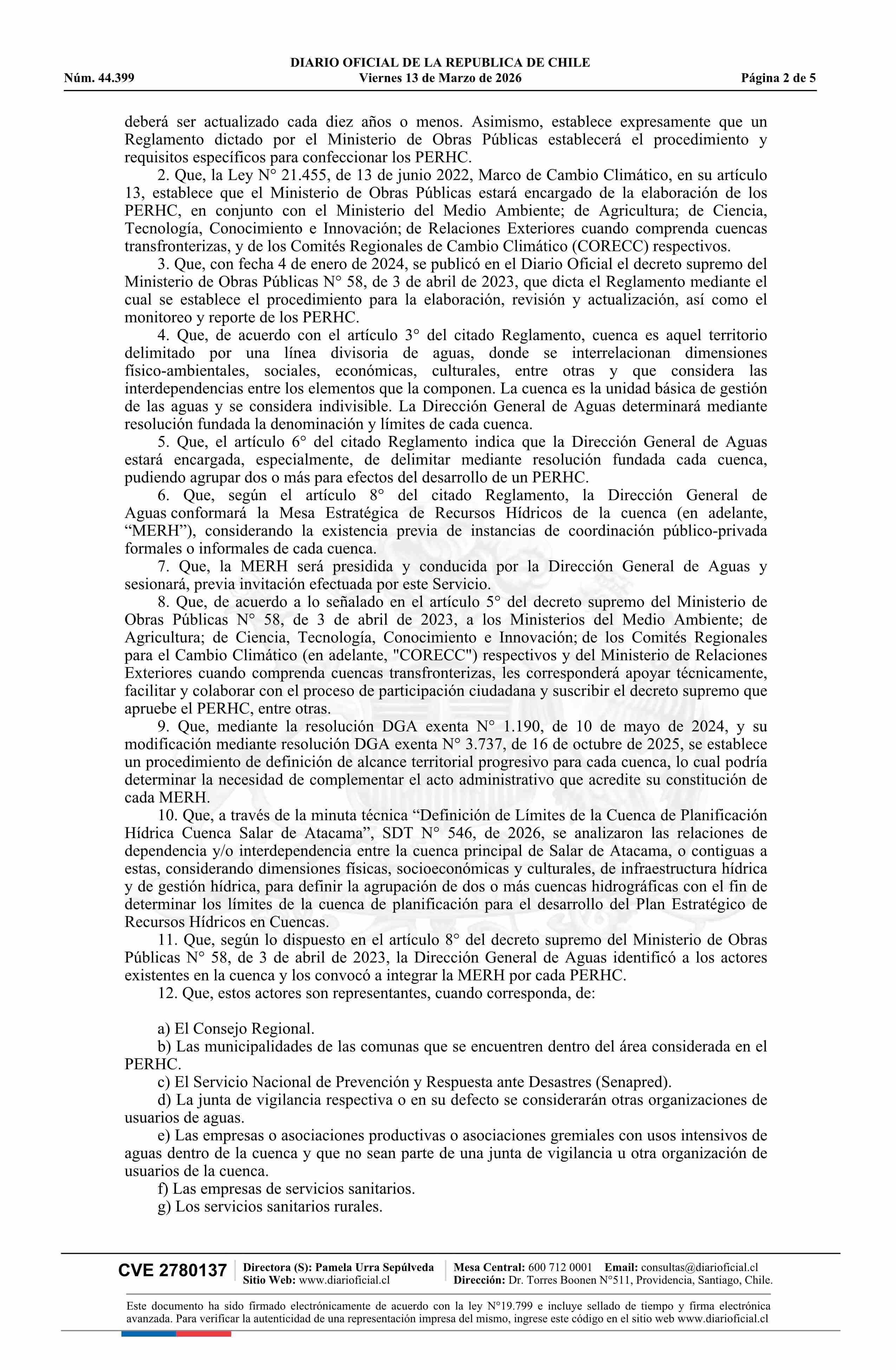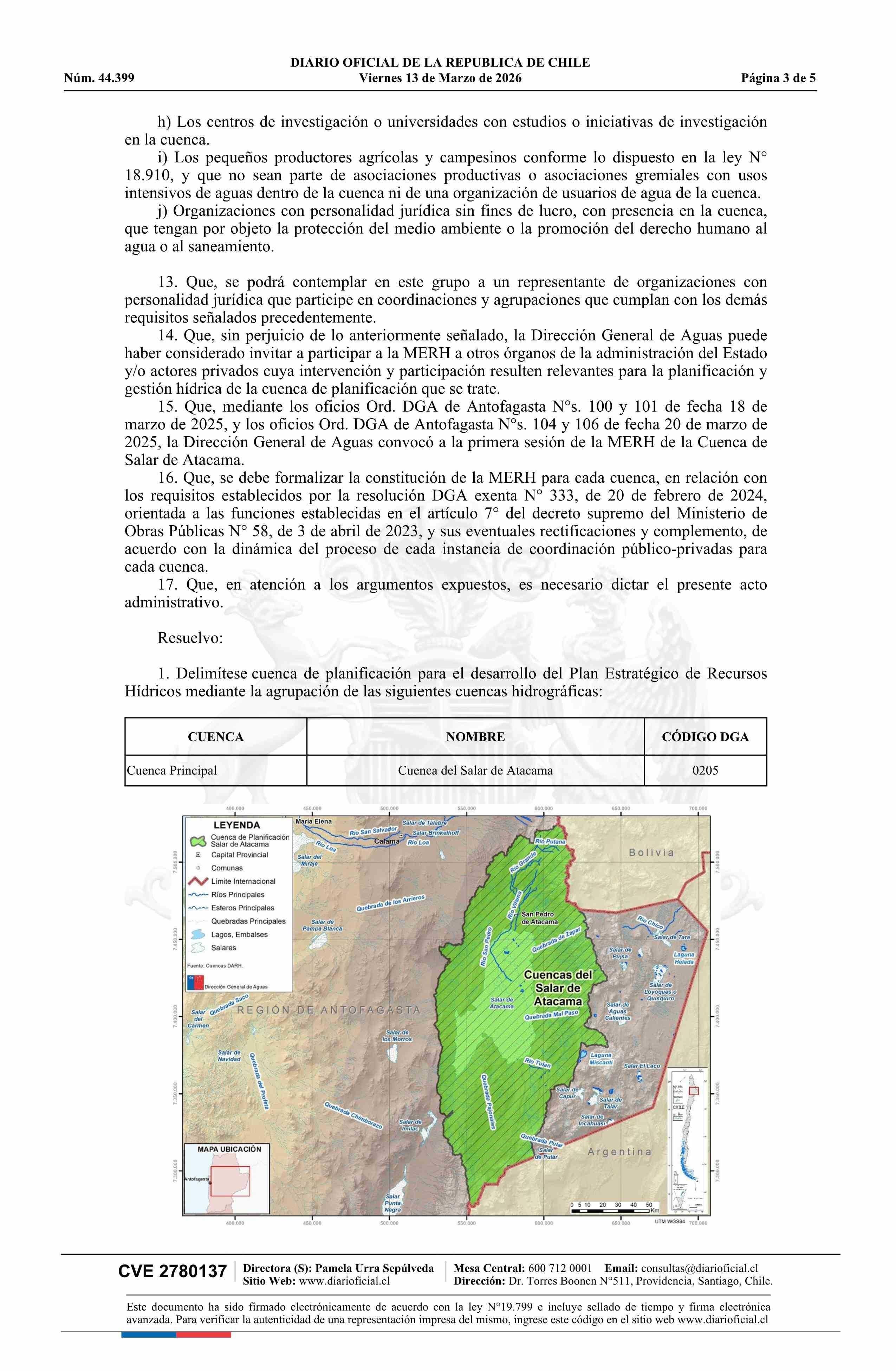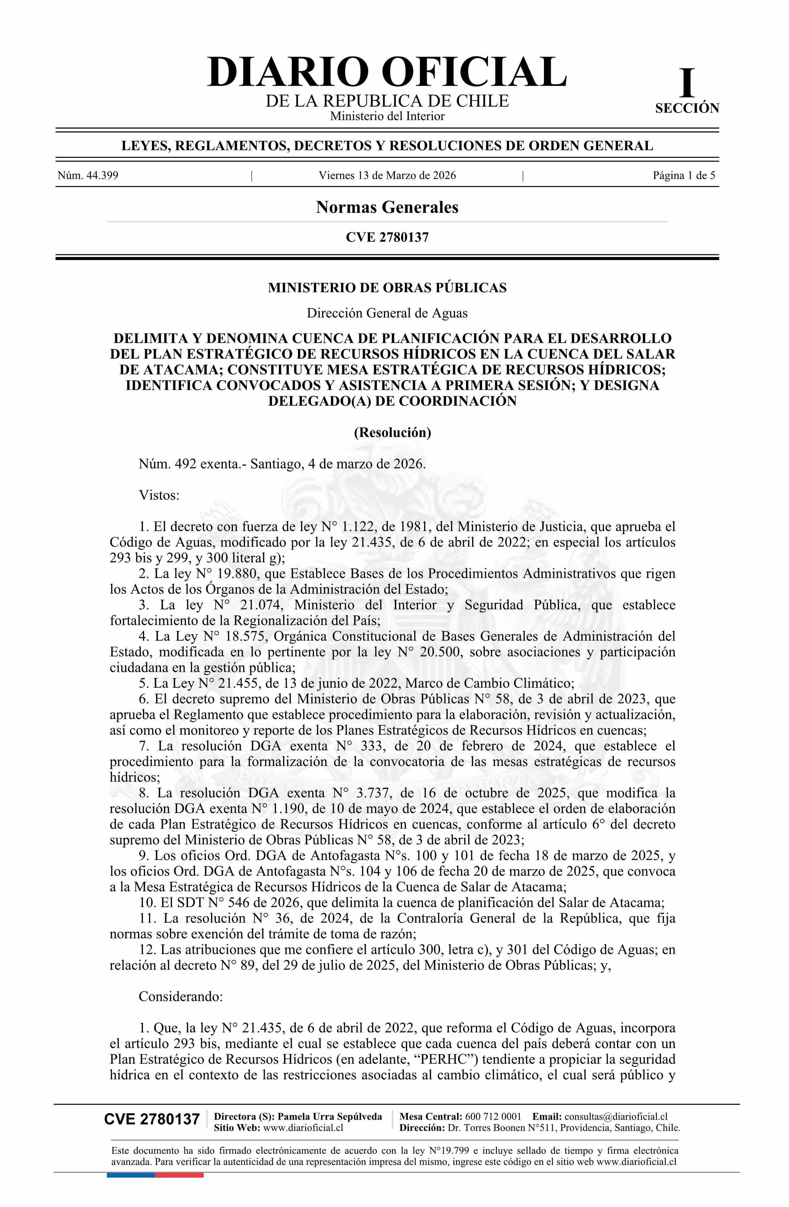 Título: Resolución exenta número 492, de 2026.- Delimita y denomina cuenca de planificación para el desarrollo del Plan Estratégico de Recursos Hídricos en la Cuenca del Salar de Atacama; constituye Mesa Estratégica de Recursos Hídricos; identifica convocados y asistencia a primera sesión; y designa Delegad