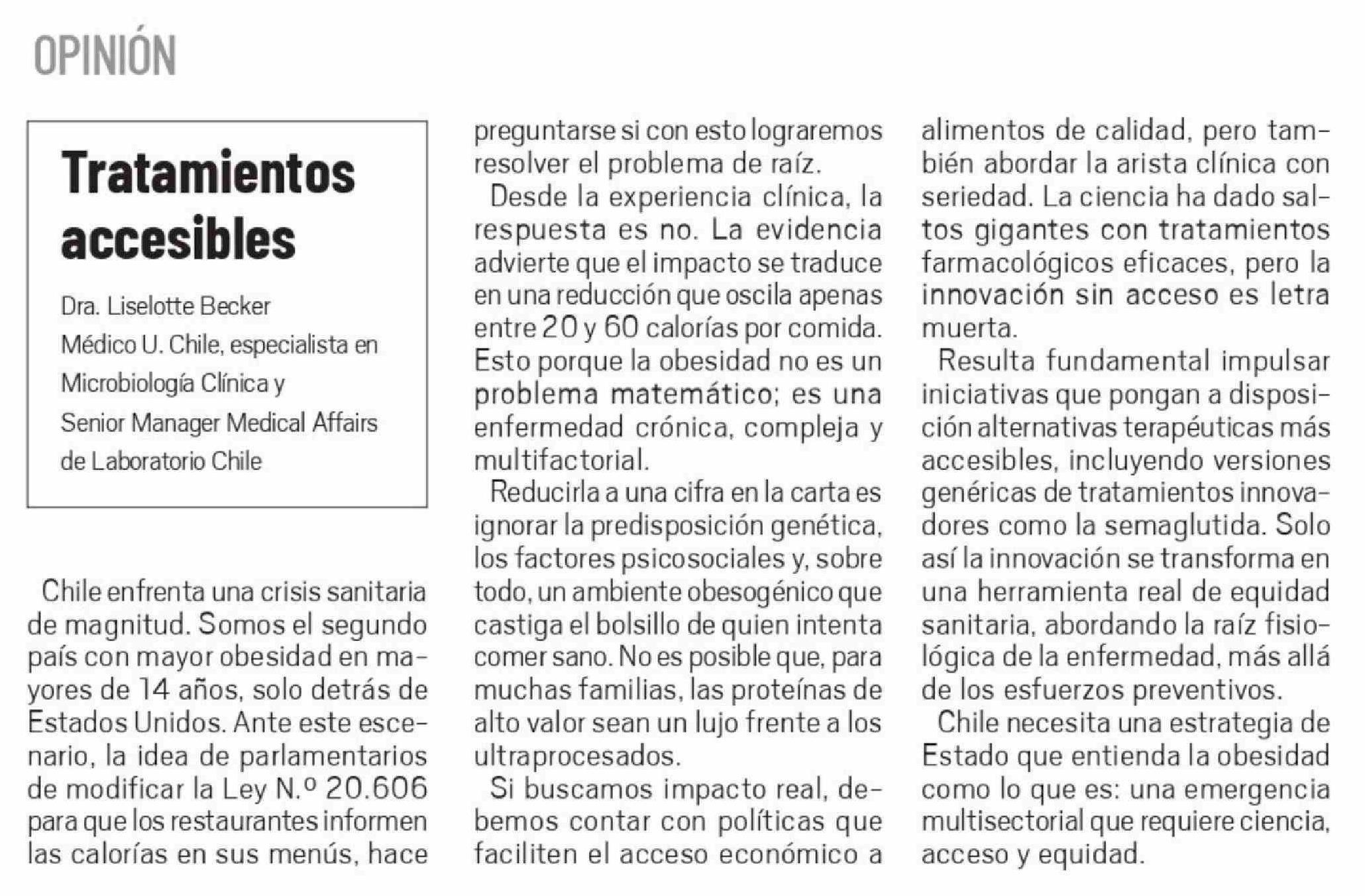 Título: Columnas de Opinión: Chile enfrenta una crisis sanitaria de magnitud. Somos el segundo país con mayor obesidad en mayores de 14 años, solo detrás de Estados Unidos. Ante este escenario, la idea de parlamentarios de modificar la Ley N.º 20.606 para que los restaurantes informen las calorías en sus me