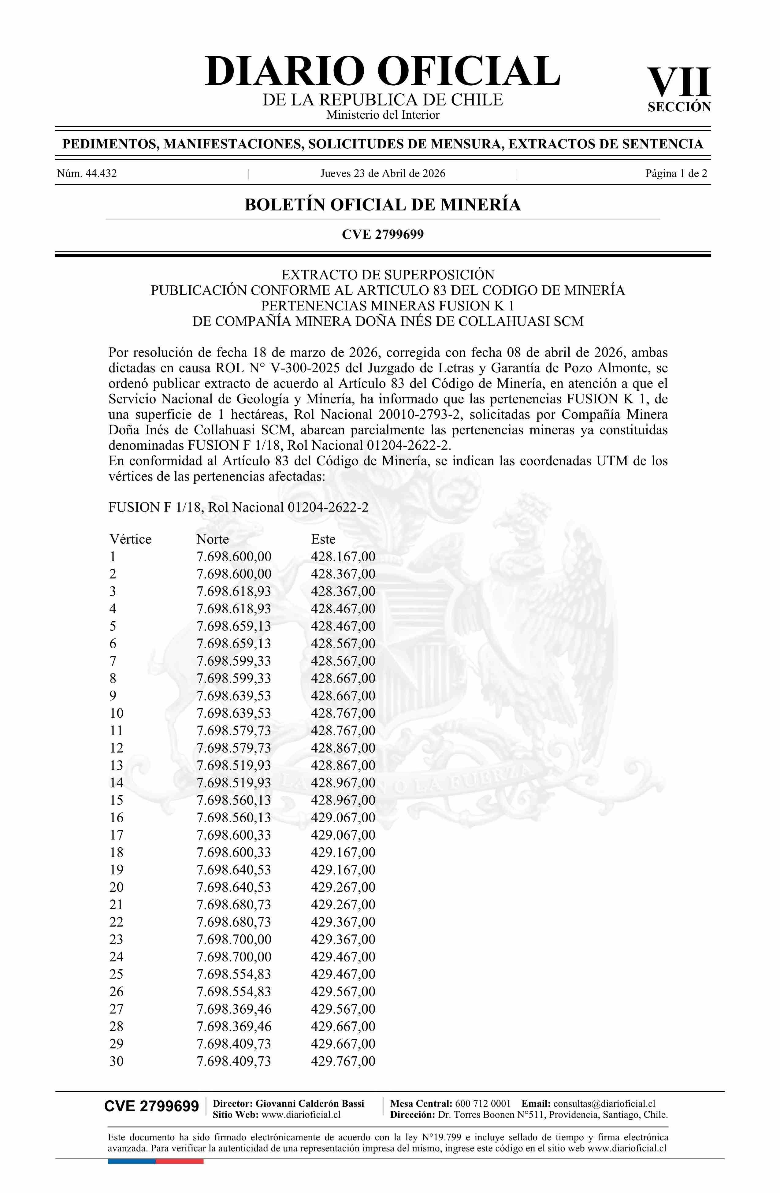 DIARIO OFICIAL CHILE - BOLETÍN OFICIAL DE MINERÍA (DIARIO OFICIAL CHILE – BOM – EXTRACTOS ARTÍCULO 83)