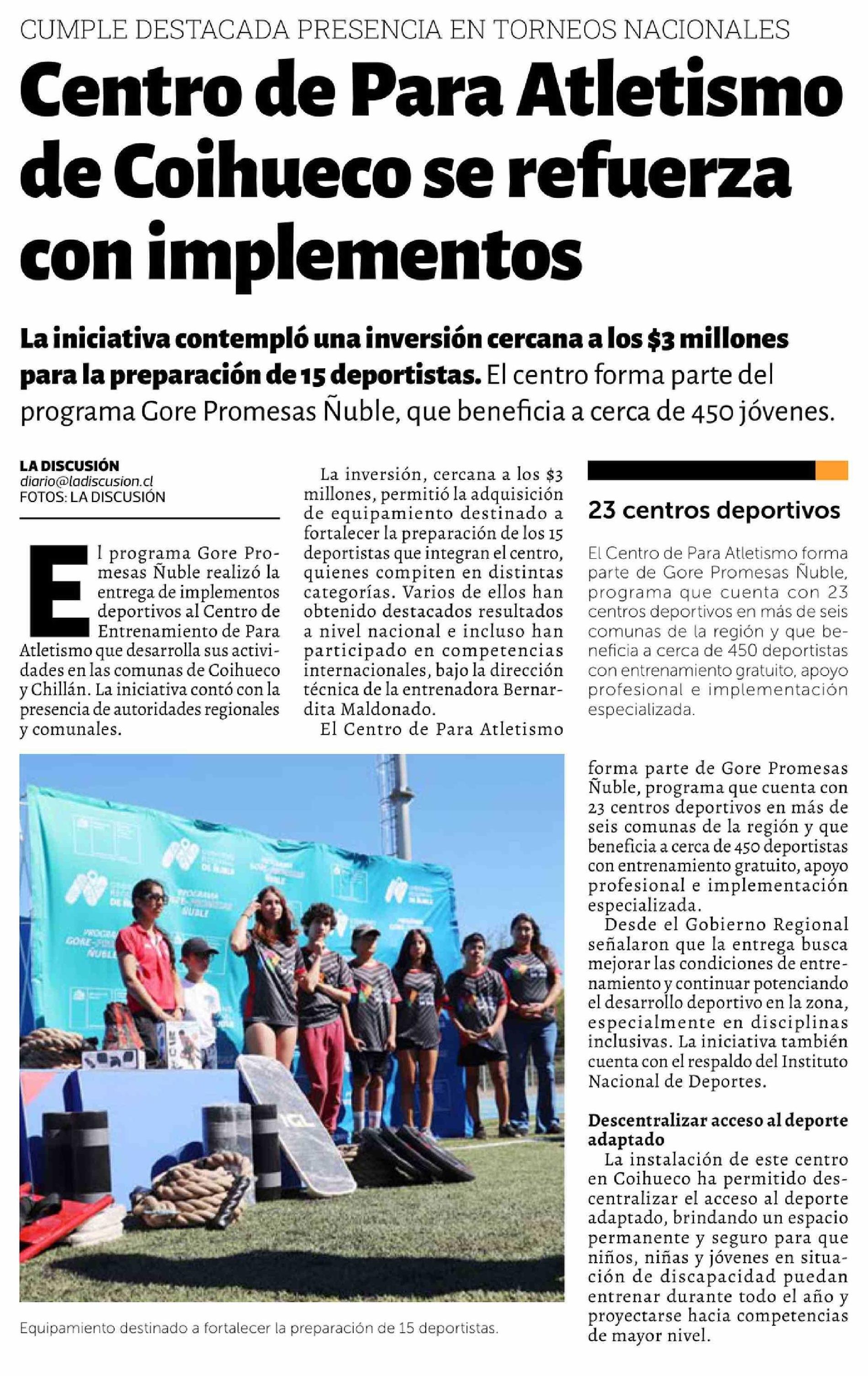 Centro de Para Atletismo de Coihueco se refuerza con implementos