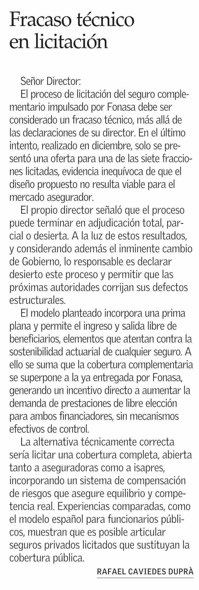 Cartas: Fracaso técnico en licitación