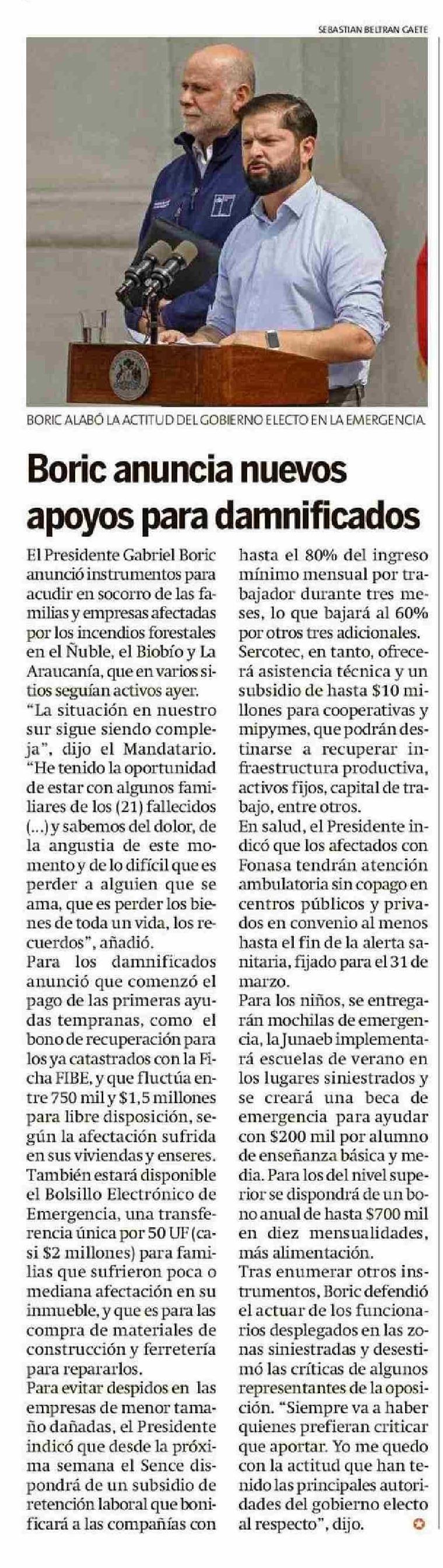 Boric anuncia nuevos apoyos para damnificados