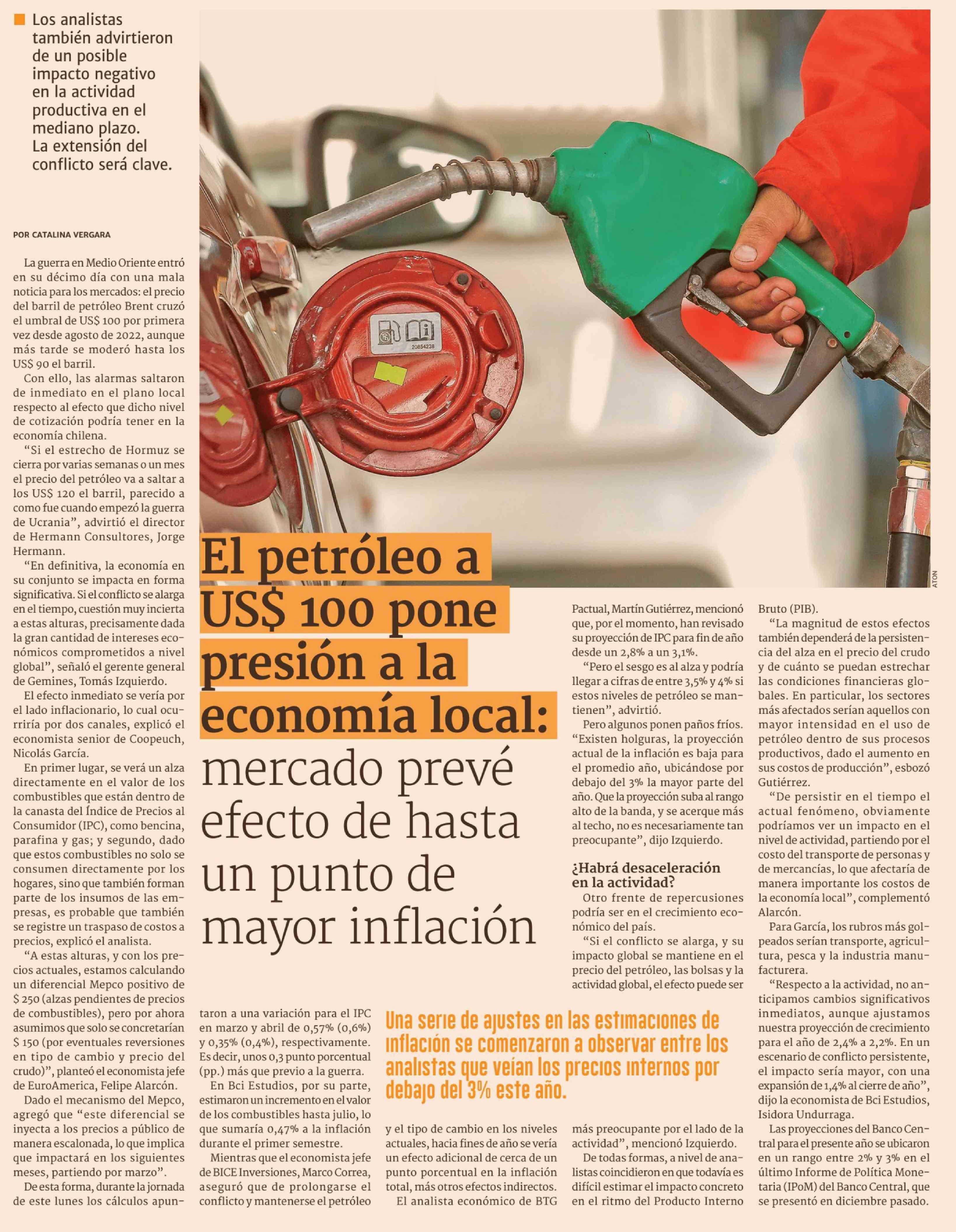 El petróleo a US$ 100 pone presión a la economía local: mercado prevé efecto de hasta un punto de mayor inflación