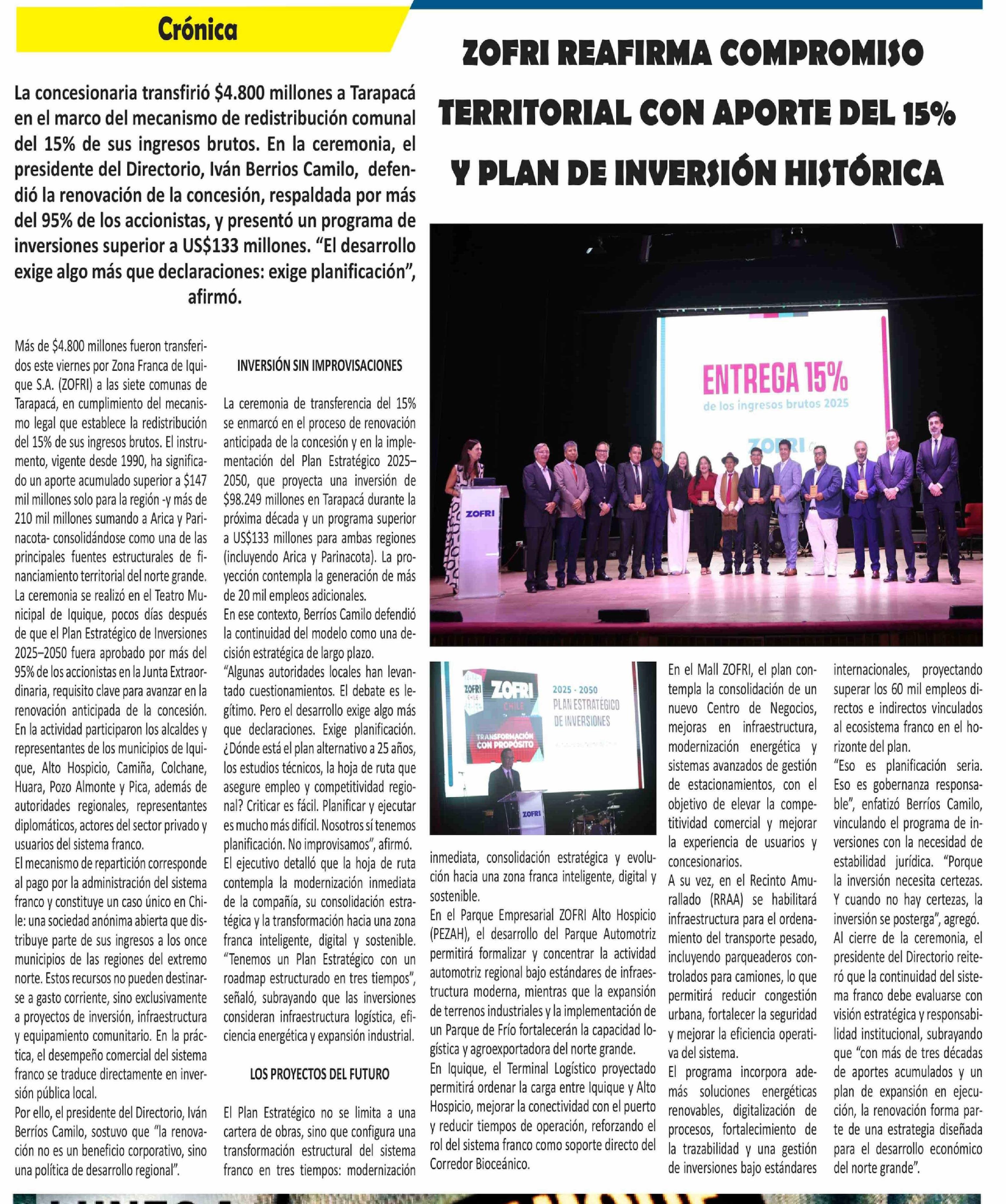 ZOFRI REAFIRMA COMPROMISO TERRITORIAL CON APORTE DEL 15% Y PLAN DE INVERSIÓN HISTÓRICA