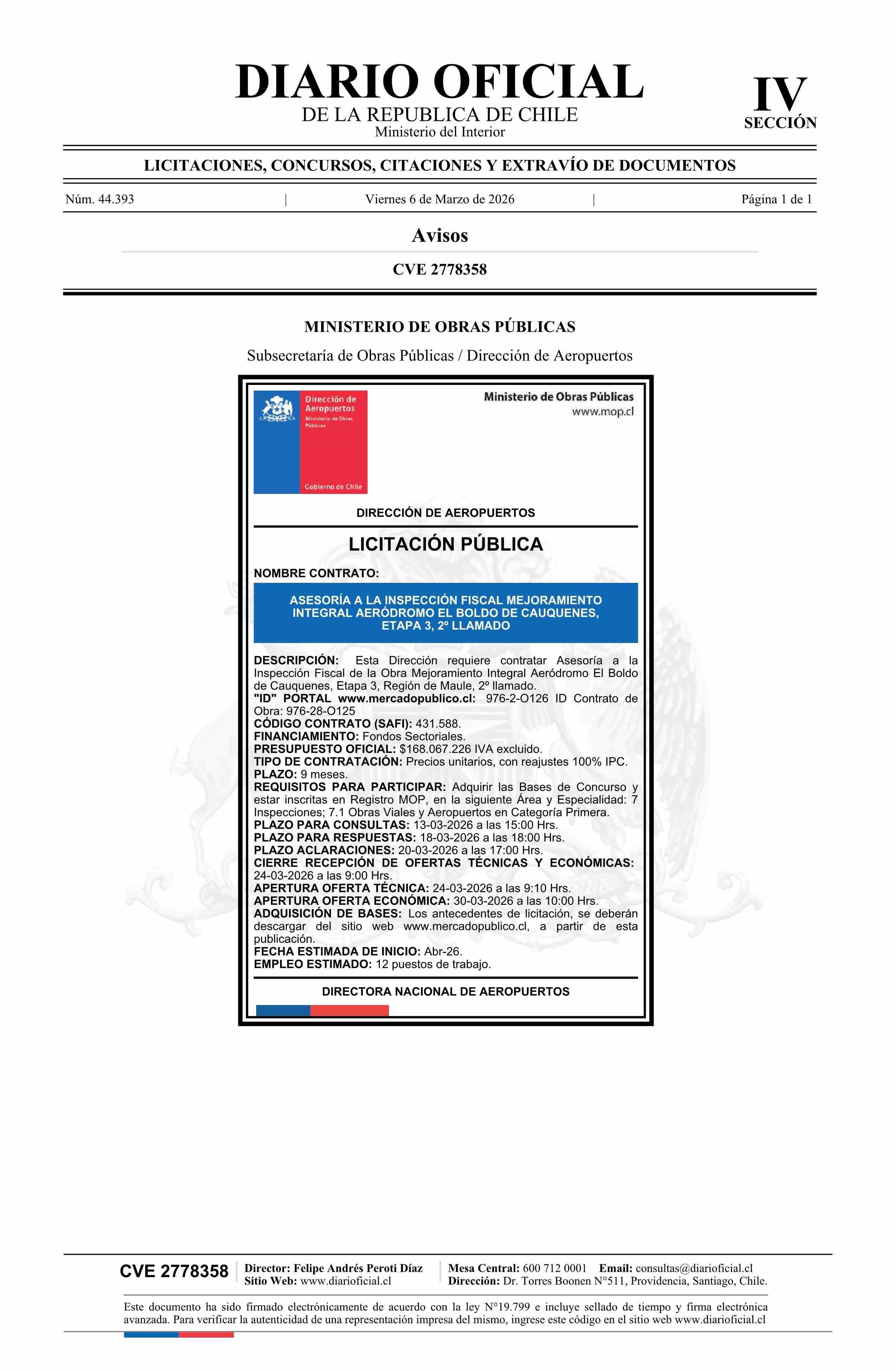 Título: AVISO LICITACIONES: Asesoría a la Inspección Fiscal Mejoramiento Integral Aeródromo El Boldo de Cauquenes, Etapa 3, 2° llamado