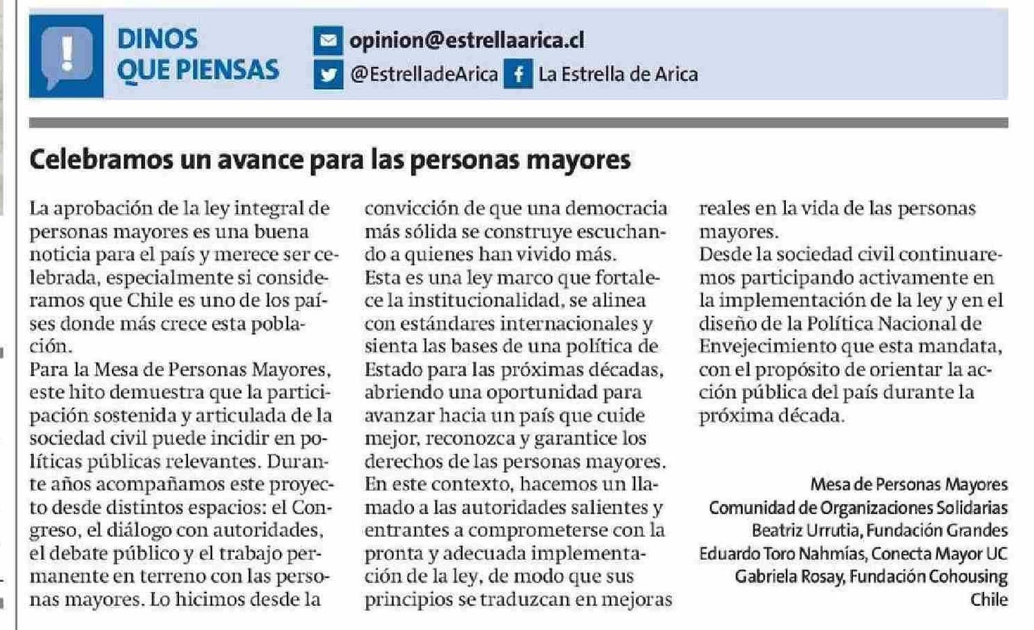 | Título: | Cartas: La aprobación de la ley integral de personas mayores es una buena noticia para el país y merece ser celebrada, especialmente si consideramos que Chile es uno de los países donde más crece esta población. Para la Mesa de Personas Mayores, este hito demuestra que la participación sostenida y a |
