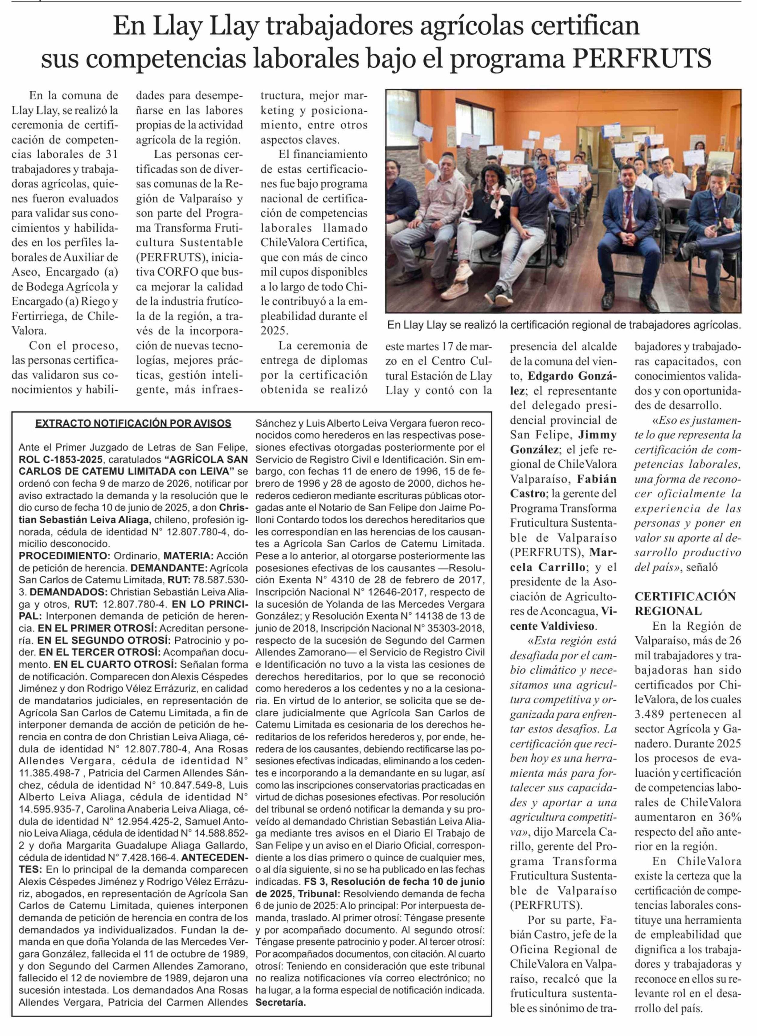 En Llay Llay trabajadores agrícolas certifican sus competencias laborales bajo el programa PERFRUTS