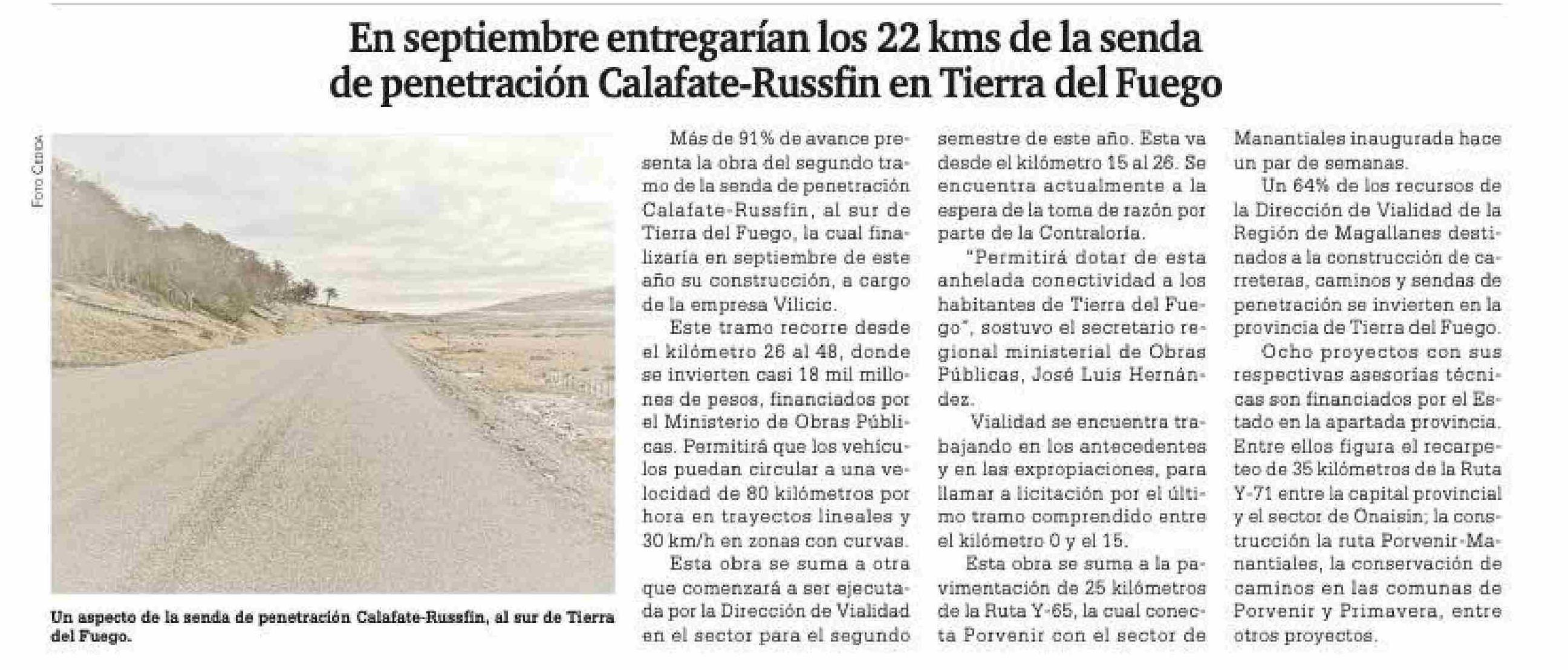 En septiembre entregarían los 22 kms de la senda de penetración Calafate-Russfin en Tierra del Fuego
