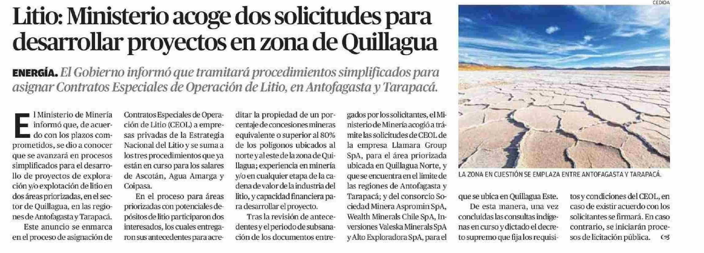 Litio: Ministerio acoge dos solicitudes para desarrollar proyectos en zona de Quillagua
